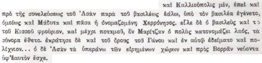 20. Срв. Heisenberg, Studien. . ., p. 512, гдето погрешно е посочено четенето на бонското издание ; в cod. Marc. 407 се чете : ὁ δὲ τοῦ Ἀσᾶν παῖς Ἰωάννης, οὔπω ἔφηβος ὤν, παρὰ τοῦ κρύφα ληφθεὶς εἰς Σκύθας ἐχώρησε . . . Правилното четене на текста бе предложено още от С. Шестаков: Виз. Врем.. IX (1904), с. 638—39, в рецензия на Хайзенберговото издание : „ἐπειρήκεν, ὡς А ὡς εἰρήκειμεν Ο. Разночтение весма интересное. На стороне чтенія А то обстоятельство, что о судьбе сына Асеня раньше в действителности ничего не говорилось. Однако такую фальшивую ссылку можно поставить в ряд других случаев того же рода у Акрополита. . . Чтение же А вызывает некоторое внутреннее противоречие с дальнейшим, так как pg. 33 сын Асеня Іоанн, действительно, оказывается, жил долгое время в русских пределах, следовательно это не бѣл только ложнѣй слух, распущенньй лицом его скрѣвшим (и что значит λαβών в тексте Гейзенберга без ближайшего определения поступка похитителя, укривателя ?). Кроме того, небольшая перестановка в тексте О могла би даже установить связь с предшесгвующим . . .“