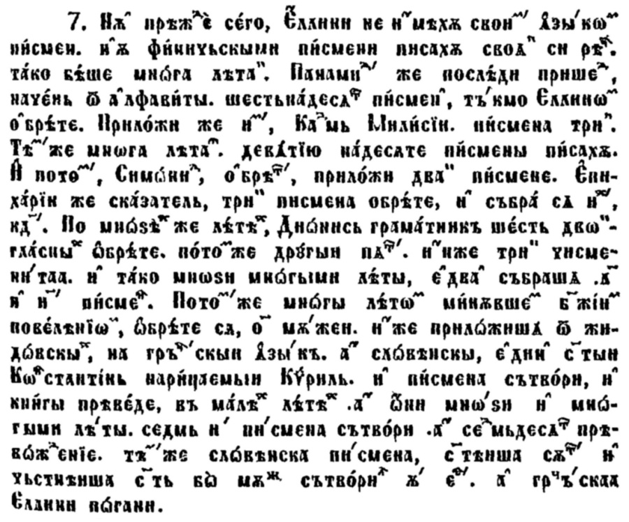 Но преди това елинитѣ нѣмаха букви на своя езикъ, а пишеха своята речь съ финикийски букви. Така бѣше много години. После се яви Панамидъ, който начена отъ алфа-вита и изнамѣри на елинитѣ само шестнадесеть букви. Къмъ тѣхъ Кадъмъ Милиски прибави три букви. Съ тѣзи деветнадесеть букви писаха много години. И после Симонидъ изнамѣри (и) прибави две букви; писательтъ Епихарий изнамѣри три букви. И събраха се 24 (букви). Следъ много години Дионисий Граматикъ изнамѣри шесть двугласни, после другъ — петь, и другъ — три за числата. И така, мнозина за много години едва събраха 38 букви. После пъкъ, като преминаха много години, намѣриха се по божия повела 70 мѫже, които преведоха отъ еврейски на гръцки езикъ [Светото Писание]. А свети Константинъ, нарицаемъ Кирилъ, самъ и славянскитѣ букви сътвори, и книгитѣ преведе въ малко години, а онѣзи — мнозина и въ много години: седемь души сътвориха тѣхнитѣ букви, а седемдесеть превода. Затова славянскитѣ букви сѫ по-свети и по-достойни за почить, защото светъ мѫжъ ги е сътворилъ, а гръцкитѣ — гърци езичници.