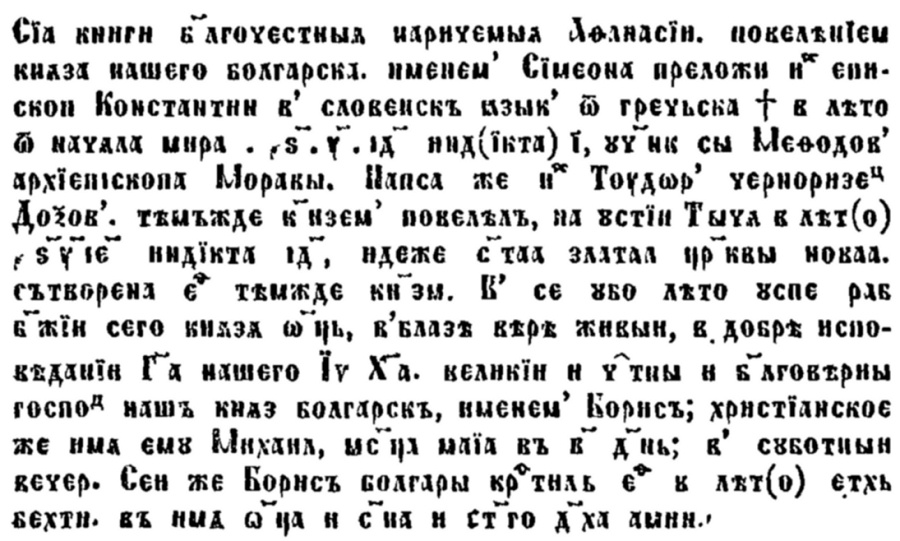 Тѣзи благочестиви книги, назовани Атанасий, преведе по повеля на нашия князъ български Симеона отъ гръцки на славянски езикъ епископъ Константинъ, ученикъ на Методия, архиепископа моравски, въ годината отъ началото на свѣта 6414 [= 906], индиктъ 10, а ги написа, по повеля на сѫщия князъ, черноризецъ Тудоръ Доксовъ, на устието на Тича въ годината 6415 [= 907], индиктъ 14, гдето е съградена светата златна нова църква отъ сѫщия князъ. Въ сѫщата година, на втори день отъ месецъ май, въ сѫбота вечерь почина рабътъ божий — бащата на този князъ — великиятъ, почтениятъ и благовѣрниятъ нашъ господарь князъ български, именуванъ Борисъ, а християнското му име е Михаилъ, които живѣ въ благовѣрие и добро изповѣдание на Господа нашъ Исуса Христа. Този Борисъ покръсти българитѣ въ годината етхъ бехти. Въ името на Отца и Сина и Светаго Духа, аминъ.