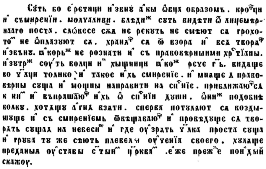 Еретицитѣ сѫ извънъ на видъ като овци: кротки, смирени и мълчаливи бледни изглеждатъ отъ лицемѣрния постъ; такива слова не ще продуматъ, не се смѣятъ громко, не се гордѣятъ, пазятъ се отъ погледъ и външно правятъ всичко, та да не бѫдатъ