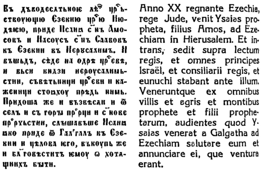 I. Въ двадесетата година отъ царуването на юдейския царь Езекия, дойде Исая, синъ Амосовъ, и Иасусъ, синъ Саавовъ, при Езекия въ Иерусалимъ. И като влѣзе, седна на царското легло, и всички иерусалимски князе, царски съветници и евнуси стояха предъ него. Дойдоха и отъ всички селища и отъ планинитѣ пророци и синове пророчески, когато узнаха, че Исая е дошелъ отъ Галгалъ при Езекия и го е поздравилъ, и заедно съ това ще му извести за онѣзи нѣща, които ще се сбѫднатъ.