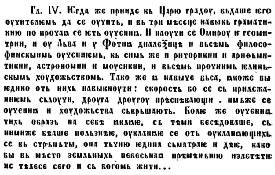 IV. Когато пристигна въ Цариградъ, дадоха го на учитель да се учи, и като изучи въ три месеца граматиката, зае се съ другитѣ науки. И изучи Хомера и геометрията, и при Лъва и при Фотия диалектика и всички философски науки, а заедно съ тѣхъ и риторика и аритметика, астрономия и музика и всички останали елински изкуства. Така (добре) изучи всички, каточели би училъ едно отъ тѣхъ. Бързината се съчетаваше съ прилежание, които се надпреварваха взаимно, а чрезъ тѣхъ се завършватъ наукитѣ и изкуствата. Но повече отъ учението той проявяваше своя кротъкъ образъ и съ онѣзи беседваше, съ които бѣше по полезно; отбѣгваше онѣзи, които се отдаваха на буйность. Той гледаше и вършеше само това, (чрезъ което) би могълъ, като замѣни земнитѣ нѣща съ небесни, да излети отъ това тѣло и да живѣе съ Бога. Логотетътъ, като го видѣ такъвъ, даде му власть