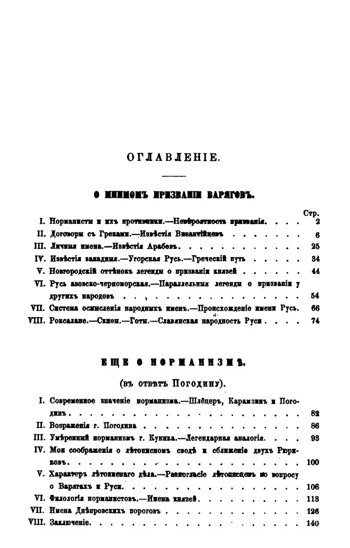 Результаты своихъ розысковъ, постепенно обнародованные въ разныхъ изданіяхъ и во многомъ несогласные съ существовавшими доселѣ теоріями, я предлагаю въ настоящей книгѣ собранными вмѣстѣ, нѣсколько дополненными и приведенными во взаимное соотвѣтствіе. Эти работы отчасти облечены были въ полемическую форму, которая въ данномъ случаѣ оказалась наиболѣе удобною для выясненія исторической истины. Онѣ отвлекли меня на значительное количество времени отъ задуманнаго труда, т. е. обозрѣнія Русской исторіи съ самаго ея начала до нашего времени. Въ настоящую минуту, благодареніе Богу, я могу представить вниманію просвѣщеннаго Русскаго общества вмѣстѣ съ результатами своихъ розысканій о началѣ Руси и первую часть самого Обозрѣнія. Въ этой первой части я открываю изложеніе Русской исторіи дѣйствительнымъ историческимъ событіемъ, т. е. осадою Царьграда; а лѣтописныя басни о Варягахъ переношу на ихъ настоящее мѣсто, т. е. въ замѣчанія о нашей книжной словесности [*].