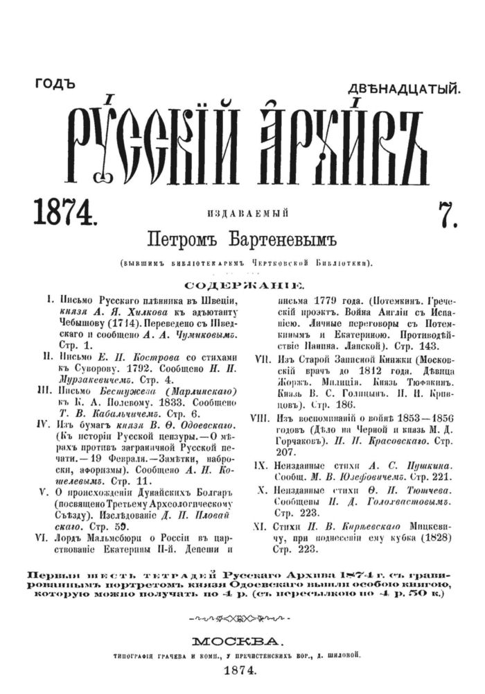 Русскій Архивъ, 1874, № 7, с. 55-144 Типографія Грачева и комп., Москва, 1874
