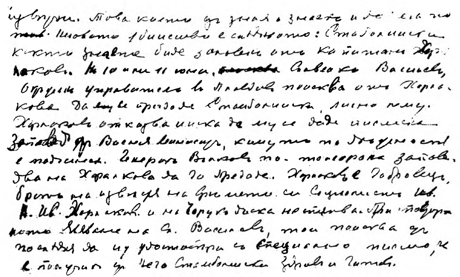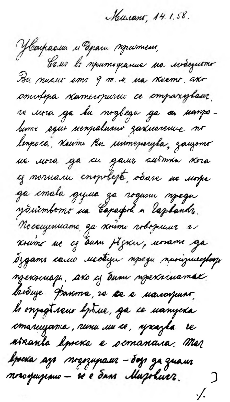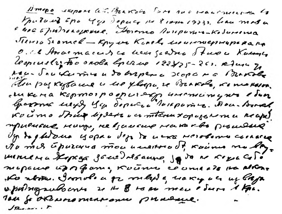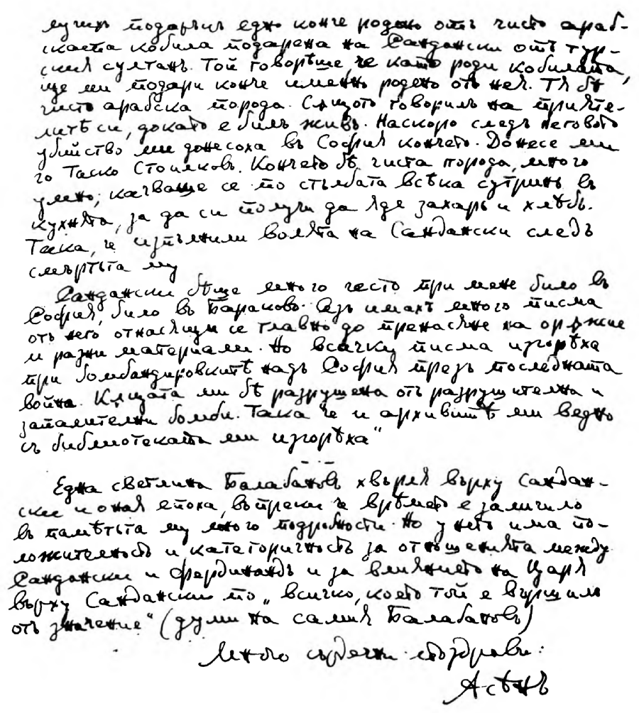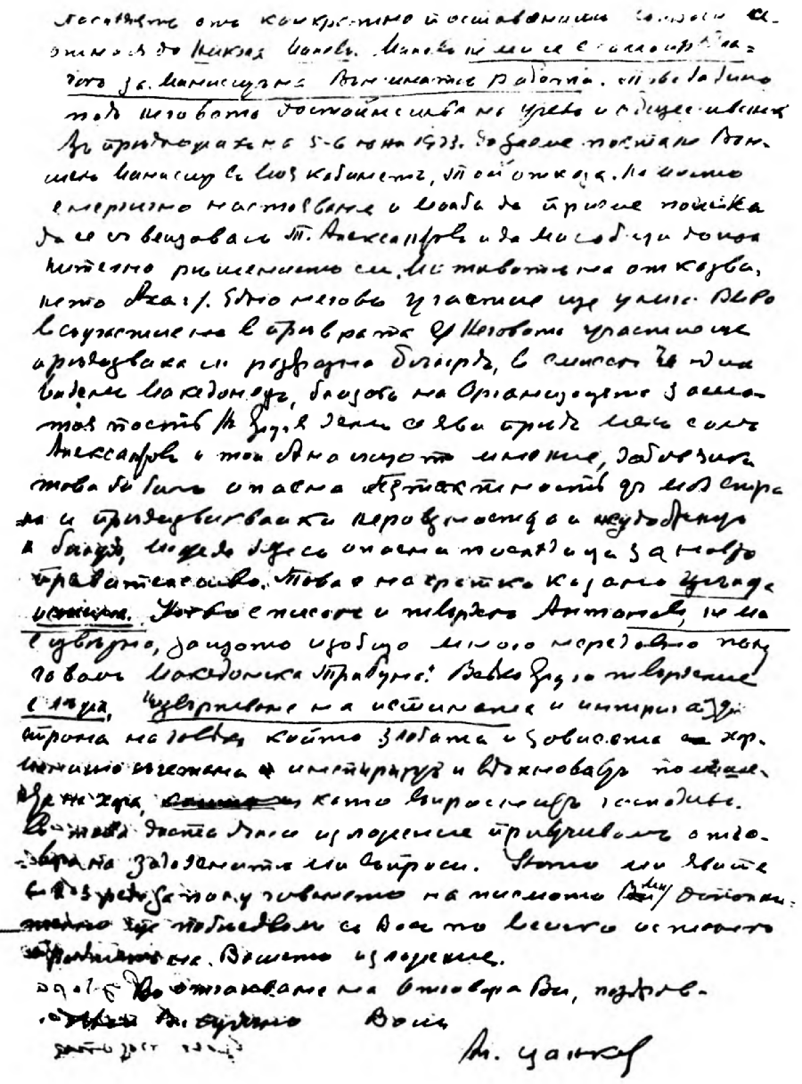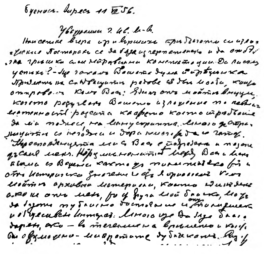 Най-сетне вчера привършихъ предългото си изложение. Постарахъ се да бѫда изчерпателенъ и да отбѣгна грешки или неправилни констатации. Дали съмъ успѣлъ ? — Ще чакамъ Вашата дума и преценка. Предметъ на следващитѣ редове сѫ две молби, които отправамъ къмъ Васъ : Единъ отъ моитѣ внуци, когато разучвахъ Вашето изложение по невнимателность разсипа кафето, което трѣбваше да ми поднесе, на манускрита. Много отъ страницитѣ сѫ негодни и дори не могатъ да се четатъ. Кореспонденцията ми съ Васъ е подредена и пазена отъ самия менъ. Но размѣненитѣ между Васъ и менъ писма сѫ важни както отъ политическо тъй и отъ историческо значение и азъ я прилагамъ къмъ моитѣ архивни материали, които единъ день, ако не отъ менъ, то отъ други мои близки, може да бѫдатъ публично достояние и отъ политически и общественъ интересъ. Много ще Ви бѫда благодаренъ, ако — въ течение на времето и колкото Ви е възможно — ми изпратите дубликатъ ...".