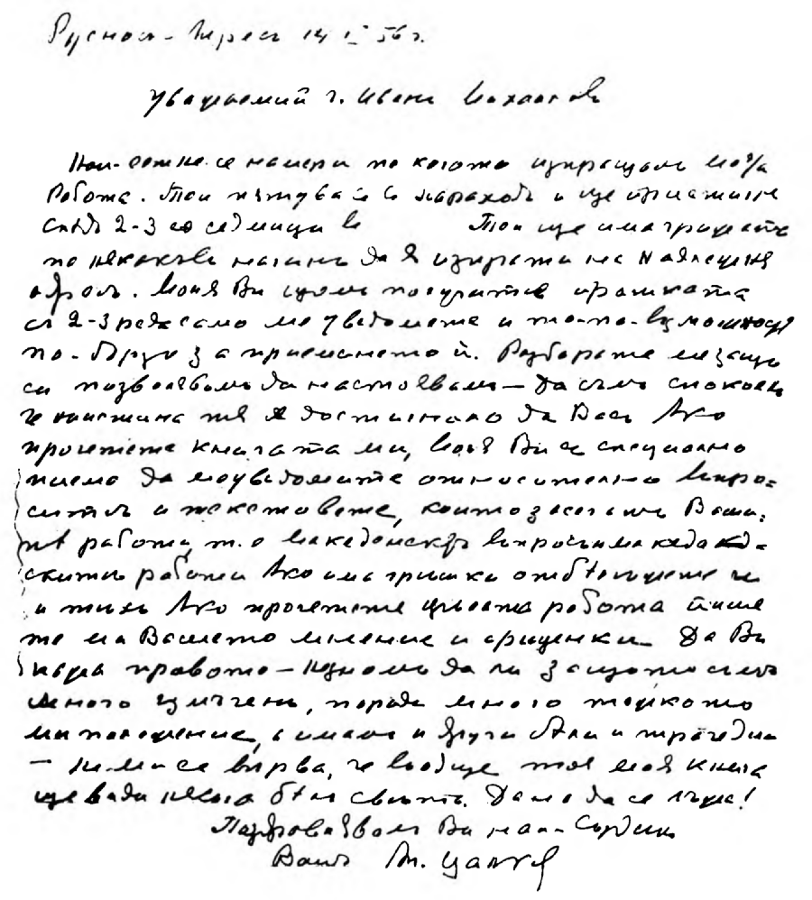 Най-сетне се намѣри по когото изпращамъ моята работа. Той пѫтува съ параходъ и ще пристигне следъ 2-3 седмици въ ... Той ще има грижата по нѣкакъвъ начинъ да я изпрати на надлежния адресъ. Моли Ви, щомъ получите пратката съ 2-3 реда само да ме уведомите и то по възможность по-бързо за приемането и. Разбирате ме защо си позволявамъ да настоявамъ — да съмъ спокоенъ, че наистина тя е достигнала до Васъ. Ако прочетете книгата ми, моля Ви съ специално писмо да ме уведомите относително въпроситѣ и текстоветѣ, които засѣгатъ Вашитѣ работи, т. е. македонскиятъ въпросъ и македонскитѣ работи. Ако има грѣшки, отбележете и тѣхъ. Ако прочетете цѣлата работа пишете ми Вашето мнение и преценка. Да Ви кажа правото —