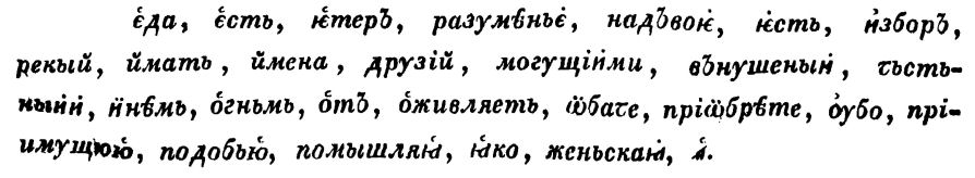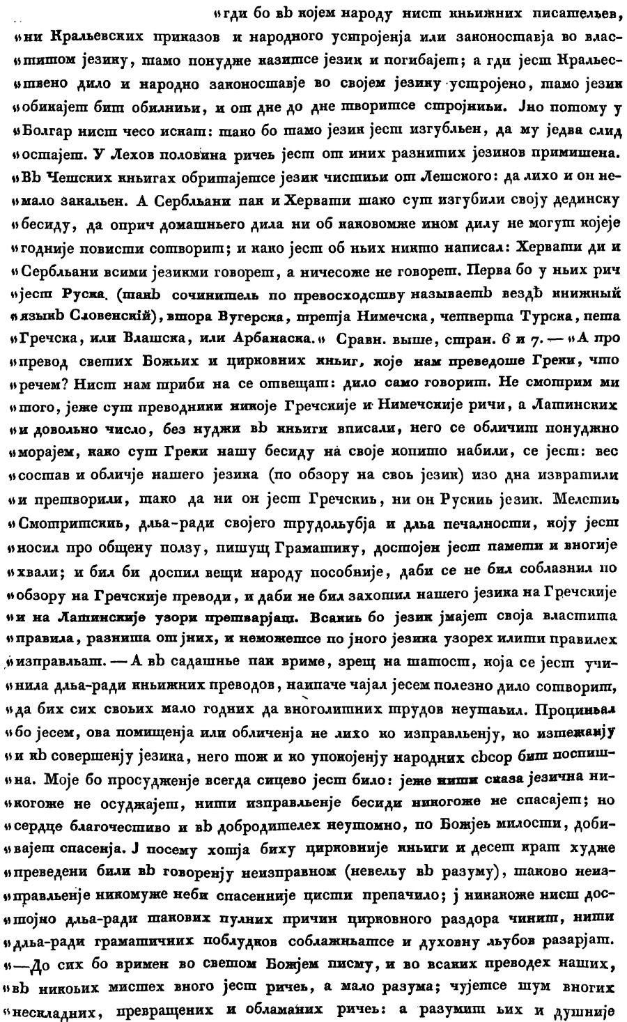 ниже писаныхъ имамы правилъ. И аще немалое число въ немъ употребляемыхъ Нѣмецкихъ, Мадьарскихъ и Турскихъ рѣчей отимемъ, ниже иный кто, много же мнѣе писатель, мысль свою изявити бы моглъ, презрѣну сущу совсѣмъ языку Словенскому, иже чистотою и обиліемъ многія превозшедый, первоначалнымъ въ правду причисляется.»