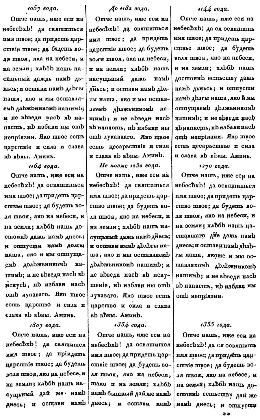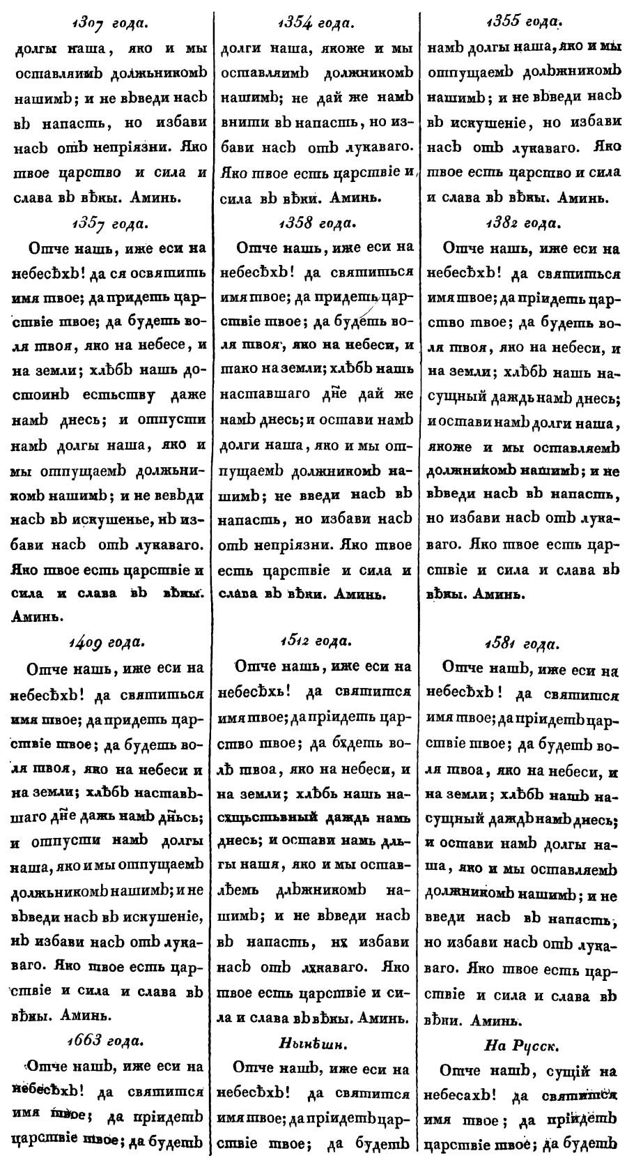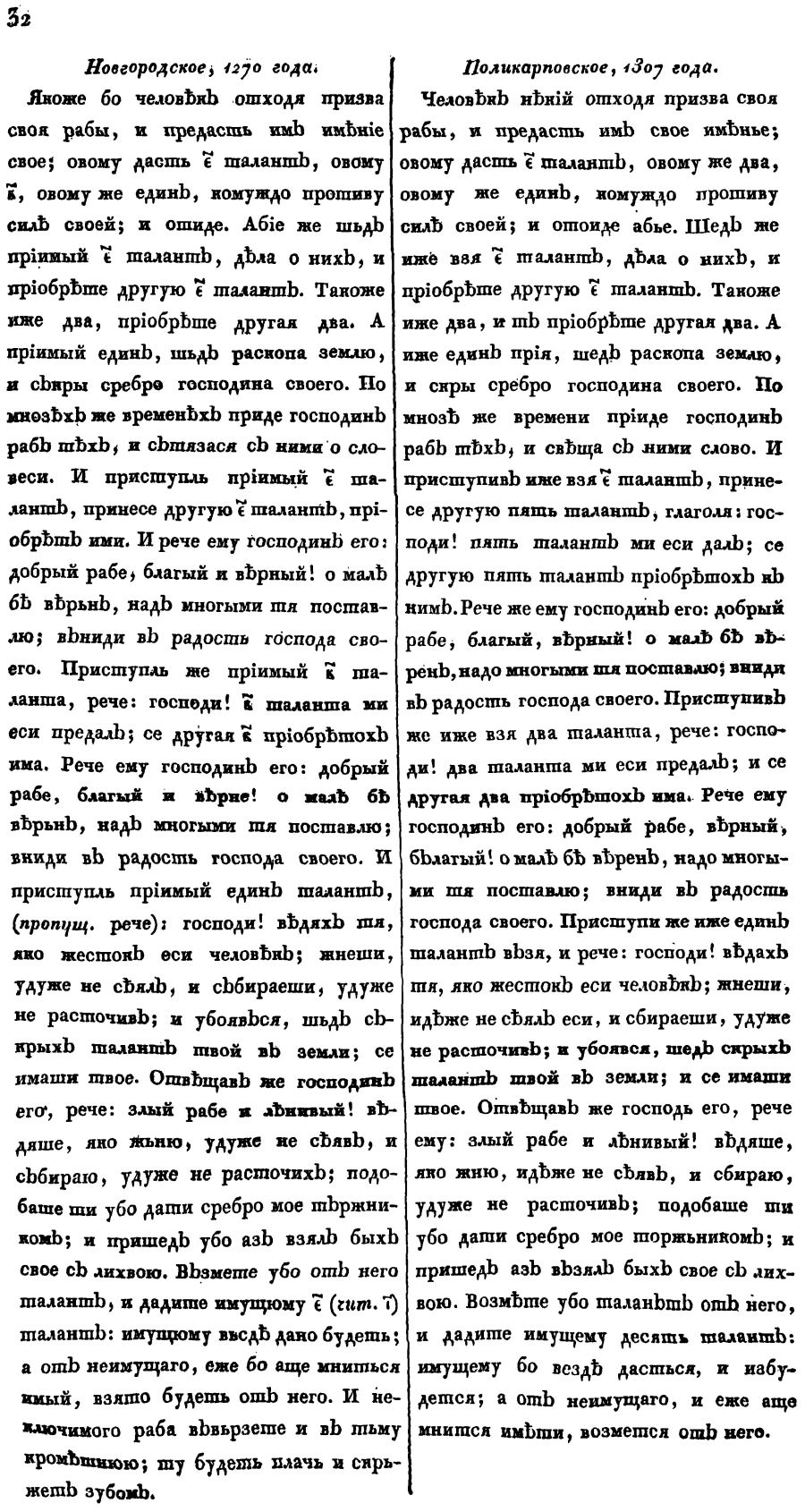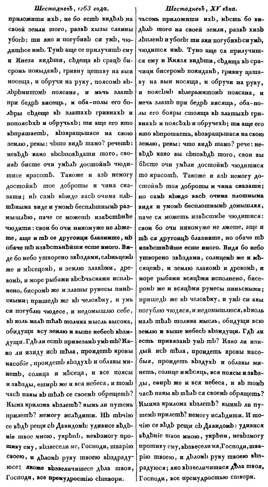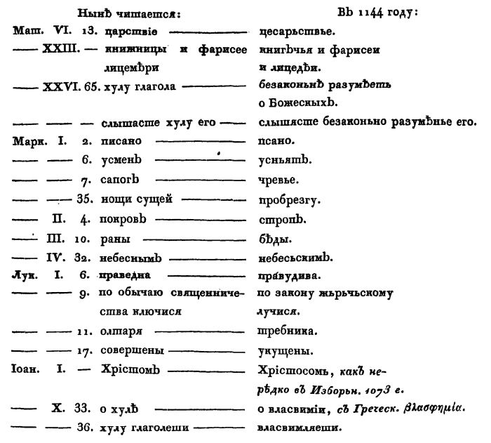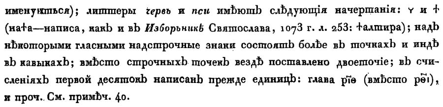 108. Въ Кормчей, написанной въ 1282 году для. Новгородскаго Архіепископа Климента (Синод. библ. № 1З2, въ листъ; — см. Русск. достопамятн. Ч. I. М. 1815, стран. 19), помѣщена слѣдующая статья: Рѣчь Жидовьскаго языка, преложена на Рускую, неразумно на разумъ, и въ Евангелихъ, и въ Апостолѣхъ, и въ Псалтыри, и въ Парміѣ и въ прочихъ книгахъ (см. въ приложен. № XII). Ни за точность словъ, ни за вѣрное толкованіе оныхъ не льзя поручиться. Въ рукописи Государственнаго Канцлера, написанной въ 1431 году, въ 4, на горѣ Лис҄ (не на Лисичьей ли близь Новгорода?), за сочиненіемъ Іоанна Лѣствичника внесено: Тлъкованіе неудобь познаваемомъ въ писаныхъ рѣчемь, понеже положены суть рѣчи въ книгахъ отъ началныихъ преводникъ ово Словенскы, и ино Сръбскы, и другаа Блъгарскы и Гръчъскы, ихже не удоволишася преложити на Рускый (см. въ приложен. № ХIII). Печатные Словенскіе Лексиконы Зизанія и Берынды относятся ко временамъ позднѣйшимъ: первый появился 1596, второй 1627 года. Тогда же составились такъ называемые Алфавиты или Азбуковники. Примѣч. 47.