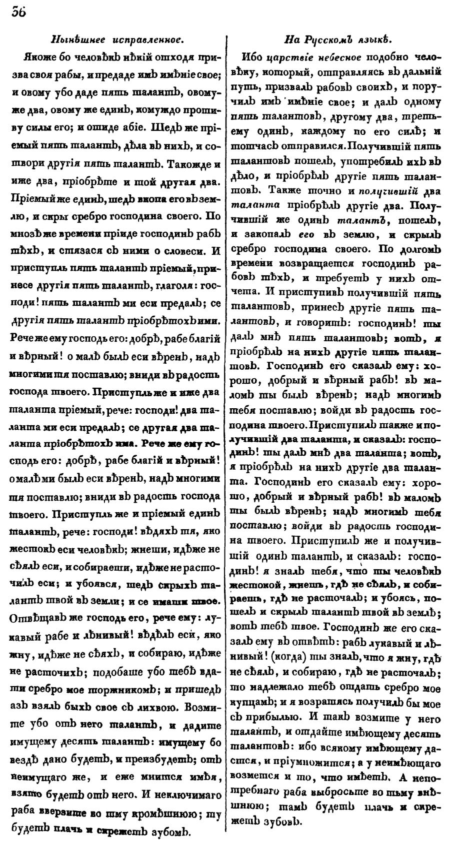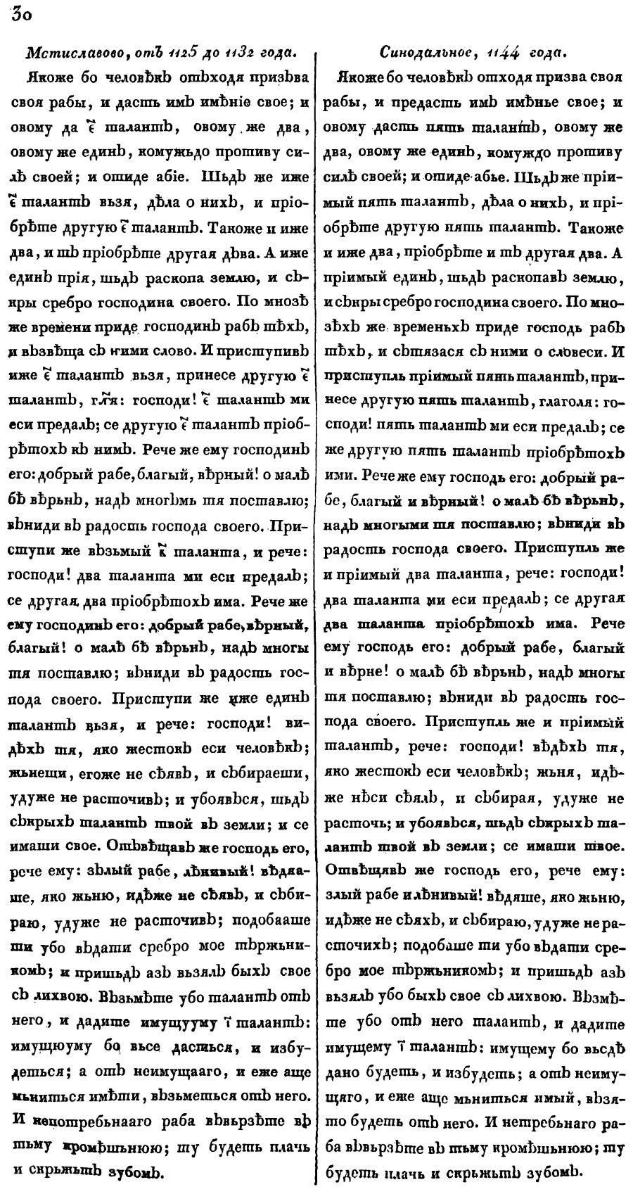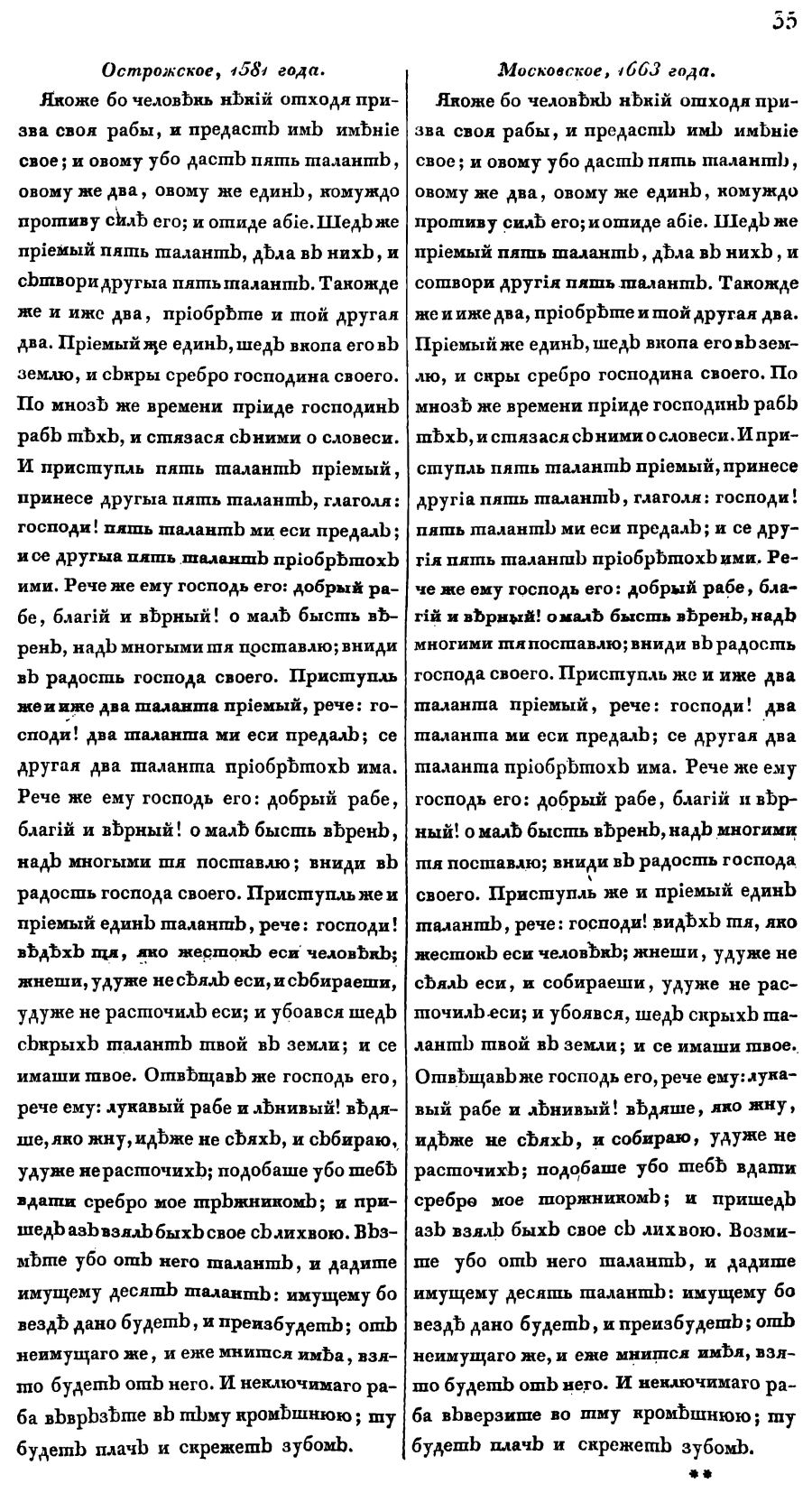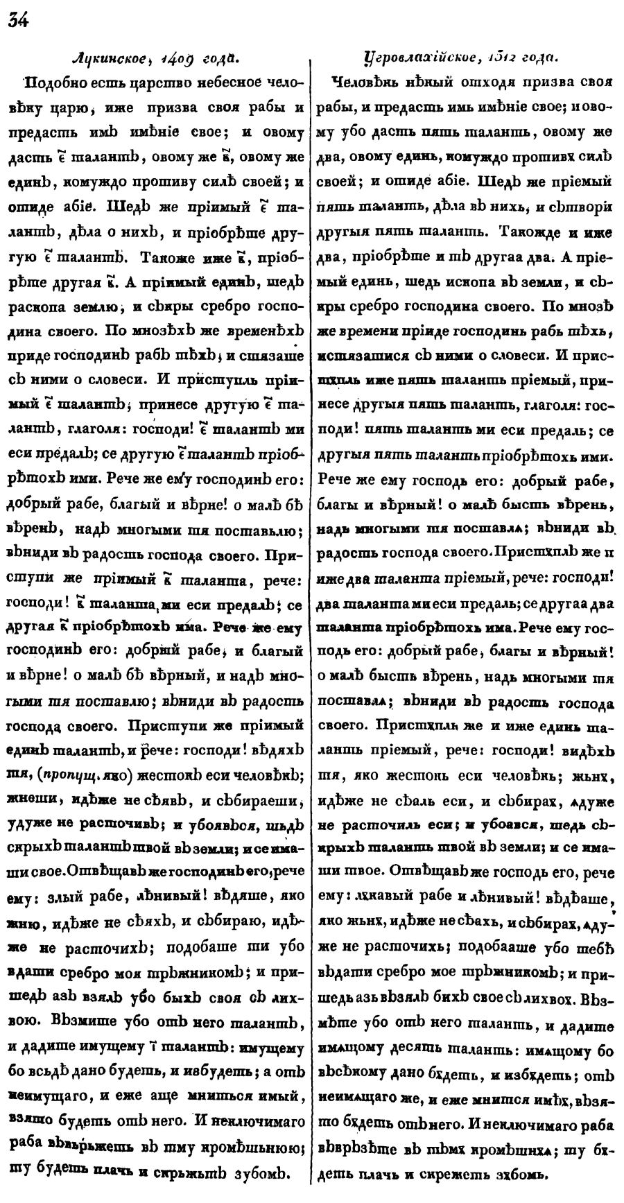 108. Въ Кормчей, написанной въ 1282 году для. Новгородскаго Архіепископа Климента (Синод. библ. № 1З2, въ листъ; — см. Русск. достопамятн. Ч. I. М. 1815, стран. 19), помѣщена слѣдующая статья: Рѣчь Жидовьскаго языка, преложена на Рускую, неразумно на разумъ, и въ Евангелихъ, и въ Апостолѣхъ, и въ Псалтыри, и въ Парміѣ и въ прочихъ книгахъ (см. въ приложен. № XII). Ни за точность словъ, ни за вѣрное толкованіе оныхъ не льзя поручиться. Въ рукописи Государственнаго Канцлера, написанной въ 1431 году, въ 4, на горѣ Лис҄ (не на Лисичьей ли близь Новгорода?), за сочиненіемъ Іоанна Лѣствичника внесено: Тлъкованіе неудобь познаваемомъ въ писаныхъ рѣчемь, понеже положены суть рѣчи въ книгахъ отъ началныихъ преводникъ ово Словенскы, и ино Сръбскы, и другаа Блъгарскы и Гръчъскы, ихже не удоволишася преложити на Рускый (см. въ приложен. № ХIII). Печатные Словенскіе Лексиконы Зизанія и Берынды относятся ко временамъ позднѣйшимъ: первый появился 1596, второй 1627 года. Тогда же составились такъ называемые Алфавиты или Азбуковники. Примѣч. 47.