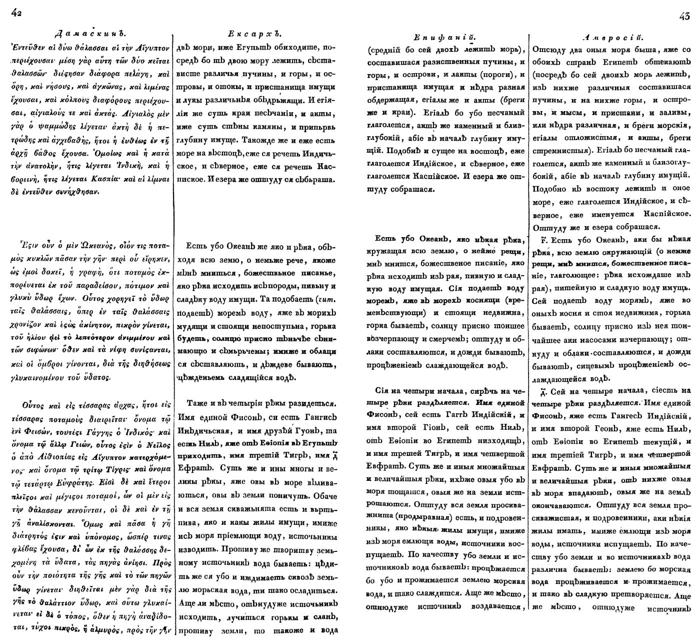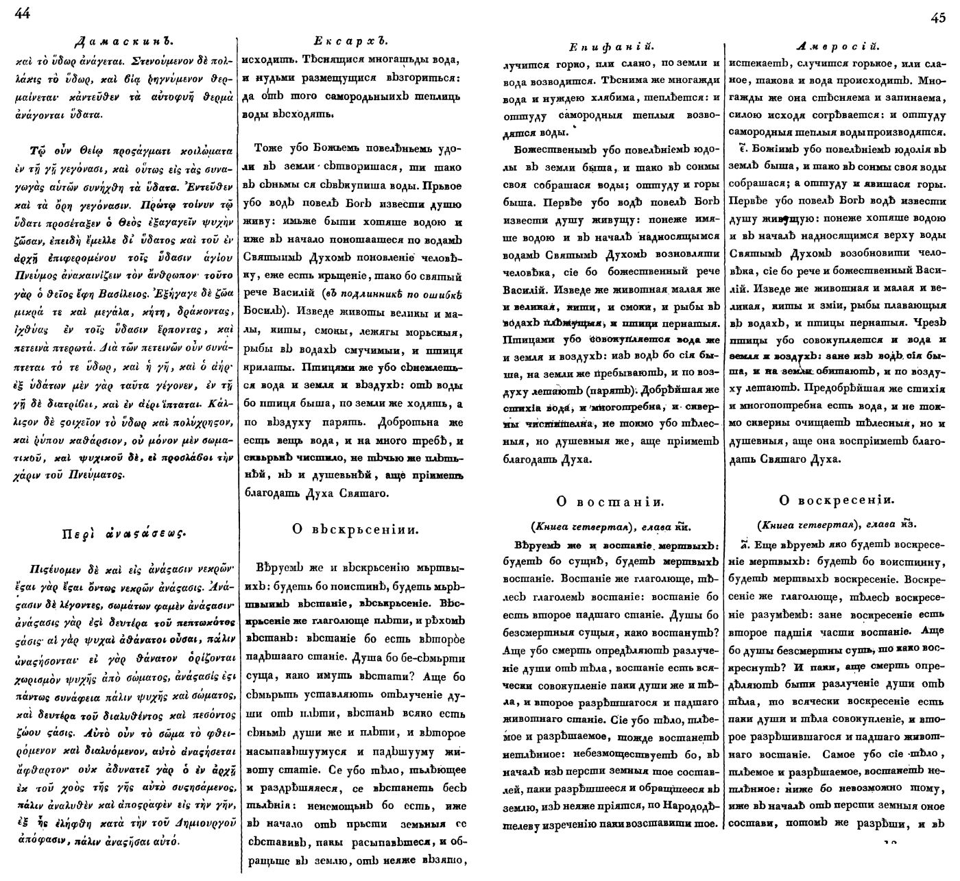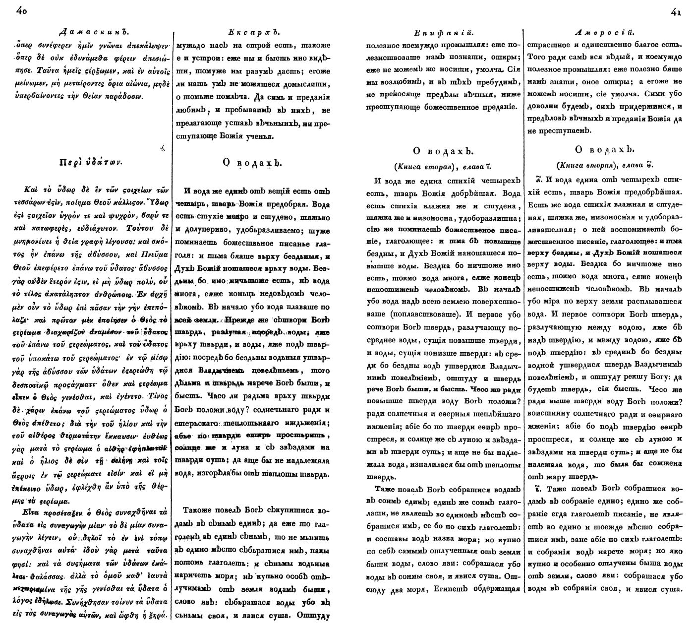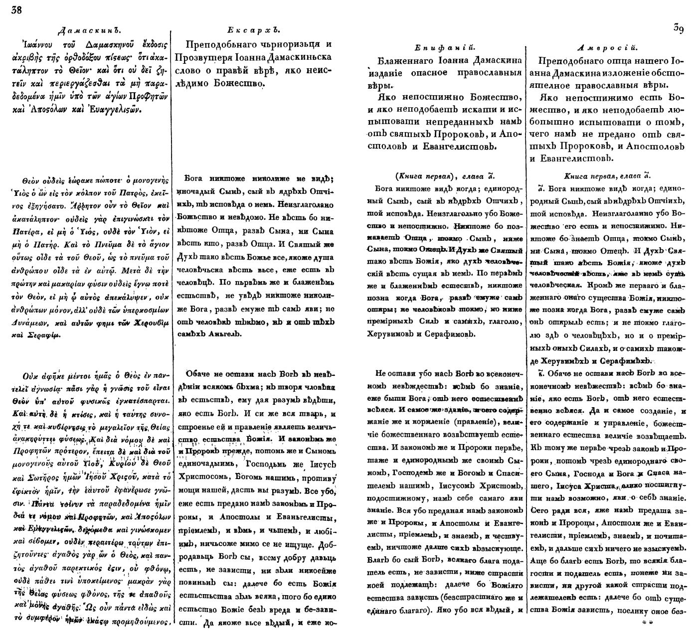 Важнѣйшій трудъ Ексарха Болгарскаго заключается въ переводѣ Богословіи, сочиненной знаменитымъ святостію жизни и просвѣщеніемъ Греческимъ писателемъ VIII вѣка, Іоанномъ Дамаскинымъ, бывшимъ Іеромонахомъ въ Лаврѣ св. Саввы († послѣ 754 г.). Словенскій переводъ, по истеченіи, можетъ быть, ста пятидесяти лѣтъ учиненный, уже по сей близости ко времени изданія своего подлинника, достоинъ прилѣжнаго изслѣдованія; но и многія другія причины заставляютъ обращать на оный полное вниманіе.