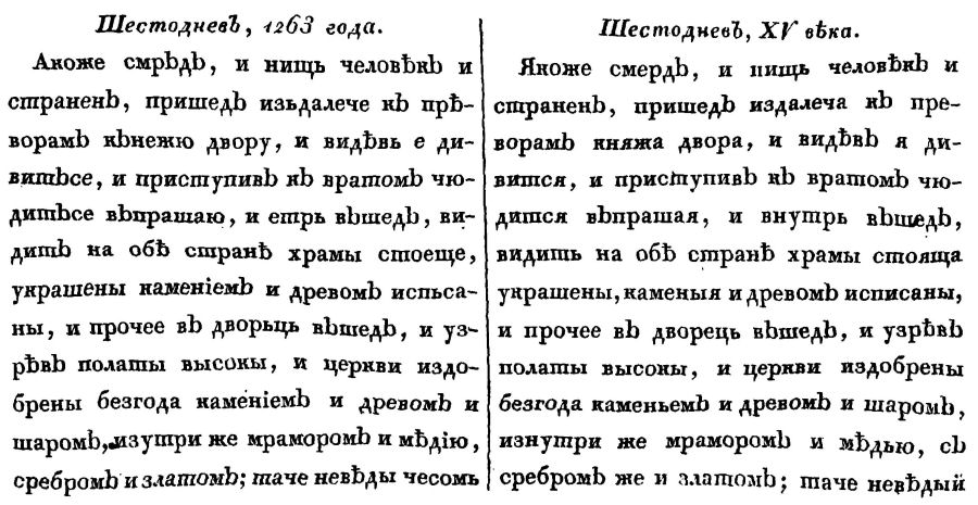 И такъ Библія, которою мы теперь пользуемся, принадлежишь къ безсмертнымъ трудамъ Меѳодія и отчасти Константина; переводъ ея относится къ концу IX вѣка. Время сдѣлало нѣкоторыя измѣненія въ слогѣ, какъ измѣняется древнее зданіе по вкусу вѣка, дѣйствію просвѣщенія или невѣжества. Грамотные исправляли переводъ, неучи портили (34).