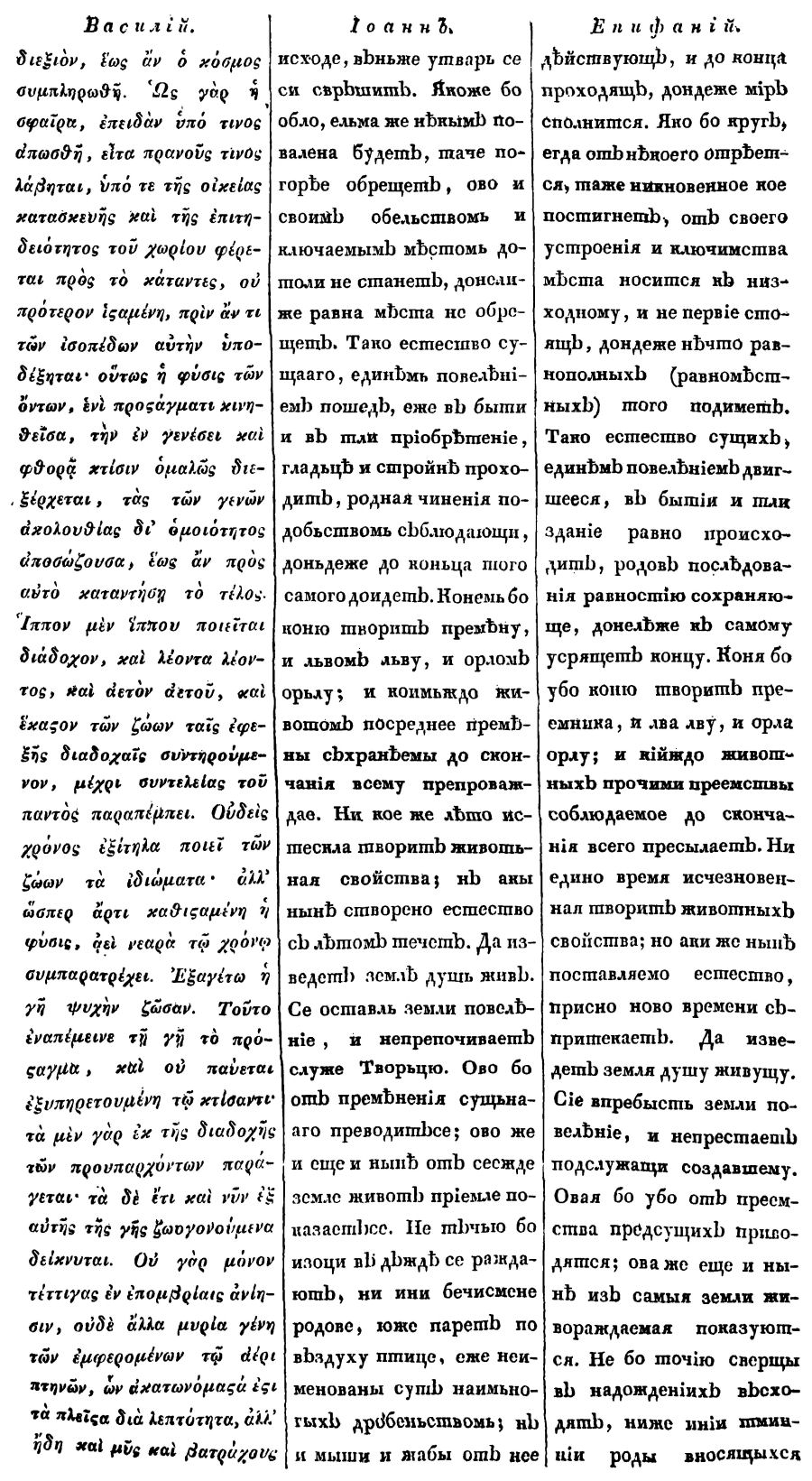 85. Въ Синодальной библіотекѣ встрѣчаются списки XV вѣка. Старинный переводъ Епифанія Славинецкаго, подъ названіемъ Бесѣдъ на Шестодневникъ, изданъ, вмѣстѣ съ другими твореніями св. Отцевъ, въ Москвѣ, 1666 года. См. примѣч. 78.