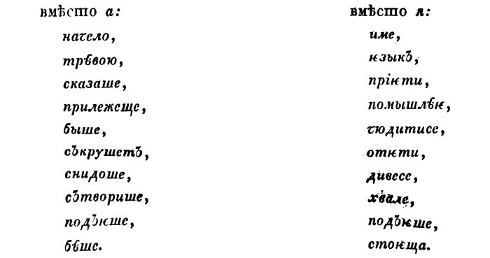 типографове!).» Въ срединѣ словъ у Берынды литтера ъ взята за о и за е: кръвь, дръжава.