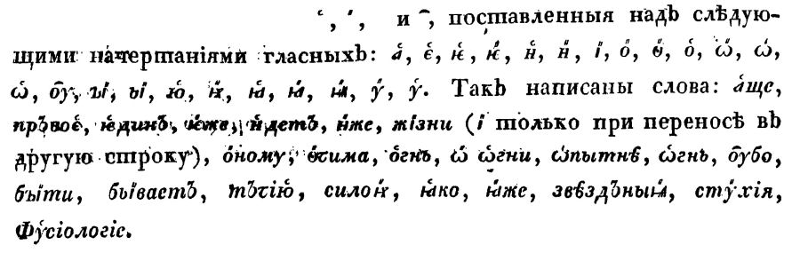 Читателямъ нашимъ, думаю, любопытно будетъ знать, что сочинитель сей Грамматики, писавшій болѣе нежели за полтораста лътъ предъ симъ, встрѣчается съ такими мнѣніями, которыя почтеннѣйшіе Филологи Гг. Востоковъ и Болдыревъ предложили ученому свѣту въ наше время. На стран. 96 онъ говоритъ: всякое прилагательное имѣетъ два отличія: простое и изрядное. Простыя прилагательныя знаменуютъ просто каково есть чтó, наприм. великъ, а, о; а изрядныя показываютъ вещь на изредъ (т. е. въ нѣкоторой высшей степени качества, если такъ должно понимать слова его: «јзредка оказујут вещ на изред, и знаменито бит такову») и дѣлаются чрезъ сложеніе простыхъ съ слогами ій, ая, ое, наприм. великій, ая, ое. Также и Г. Востоковъ (примѣч. 63) согласно съ симъ называетъ прилагательныя усѣченныя простыми, и производитъ отъ нихъ сложныя, но только чрезъ прибавленіе личнаго мѣстоименія й, ı-а и ѥ (онъ, а, о), а не просто слоговъ ій, ая, ое (*).