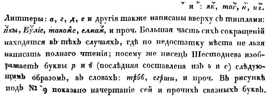 Слѣдуя, согласному показанію, должны мы приписать честь изобрѣтенія Словенской азбуки, и теперь оставшейся въ употребленіи, съ немногими исключеніями, блаженному Кириллу, коего именемъ оная доселѣ называется (7). Послѣдующіе труды братьевъ,