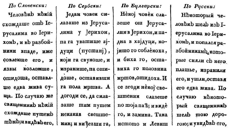 Показанное различіе должно отнести и къ книгамъ, приводимымъ Раичемъ при Исторіи Словенскихъ народовъ, въ изчисленіи его источниковъ, изъ коихъ Сербская Исторія Деспота Георгія Бранковича описана старимъ Сербскимъ штиломъ, Цароставникъ, у нѣкихъ Троадникъ, древный Сербскій рукопись, Словенски; напечатанная же въ Вѣнѣ (1794) Молитвенна книга Кесаря Іосифа, переведена съ Нѣмецкаго на простой Сербскій языкъ. Первыя писаны на Словенскомъ церковномъ, съ примѣсью Сербскаго нарѣчія, какъ видно изъ приводимыхъ Раичемъ примѣровъ, хотя, кажется, нѣсколько исправленныхъ; а Молитвенна книга переведена на употребляемое нынѣ Сербами нарѣчіе, для коего недавно одинъ ученый ихъ однородецъ первый составилъ правила (18).