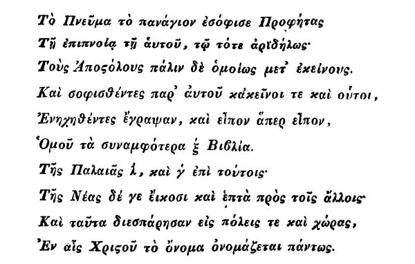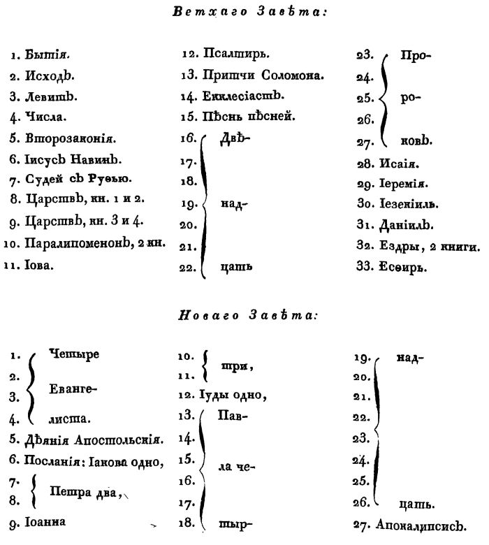 «Святый Духъ, давшій силу вдохновенія Пророкамъ, тѣмъ же наитіемъ дѣйствовалъ и на Апостоловъ; они составили шестьдесятъ книгъ: Ветхаго тридесятъ и три надъ сими, Новаго же двадесять и седмь ко онѣмъ. Сіи книги разсѣялись по разнымъ странамъ, гдѣ проповѣдуется имя Хрістово (30).»