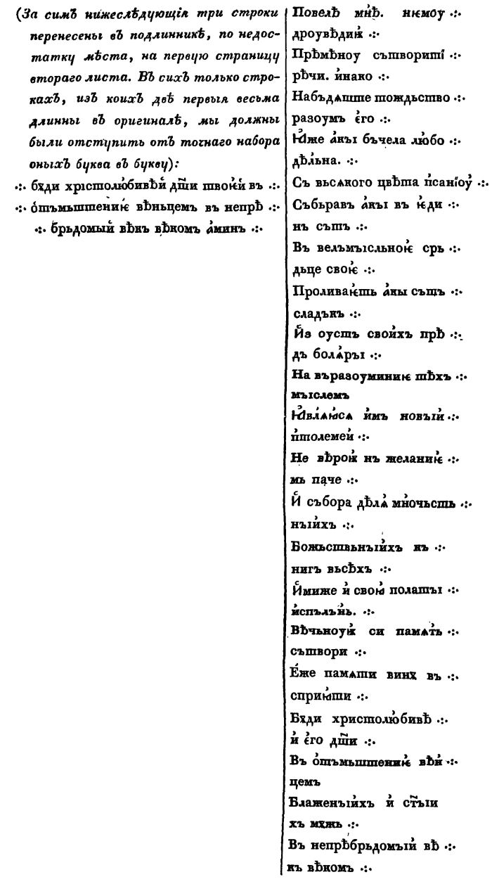 Третья, не менѣе важная, библіографическая рѣдкость есть Служебникъ (въ библіотекѣ Графа Толстаго), изданный, въ малую 4, тѣмъ же Божидаромъ, который напечаталъ Сборникъ. Выписываемъ для образца слога нѣкоторыя мѣста послѣсловія: