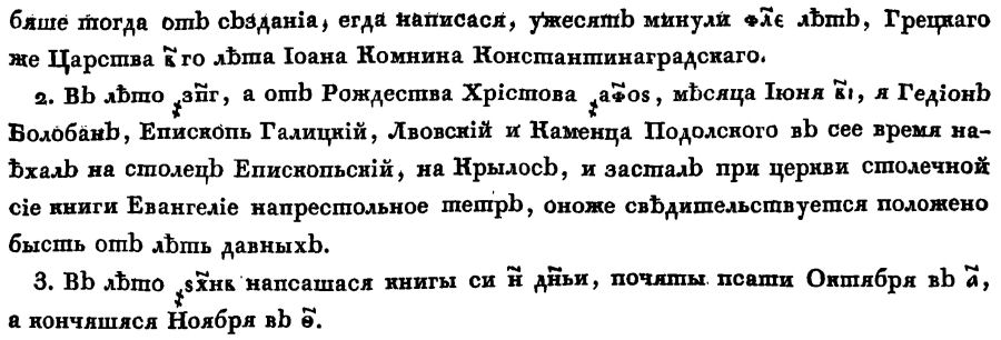 Упомянутыхъ свидѣтельствъ довольно было бы для ума наблюдательнаго, въ доказательство древности нашего переводчика; но онъ собственными словами, въ началѣ часто приводимаго предисловія, кажется, представляетъ себя современникомъ Константина, скончавшагося около 871 и Меѳодія, умершаго предъ послѣднимъ годомъ сего столѣтія. Приведемъ сіе мѣсто изъ древнѣйшаго списка въ сравненіи съ Волоколамскимъ ХѴІ вѣка, о коемъ будетъ сказано ниже: