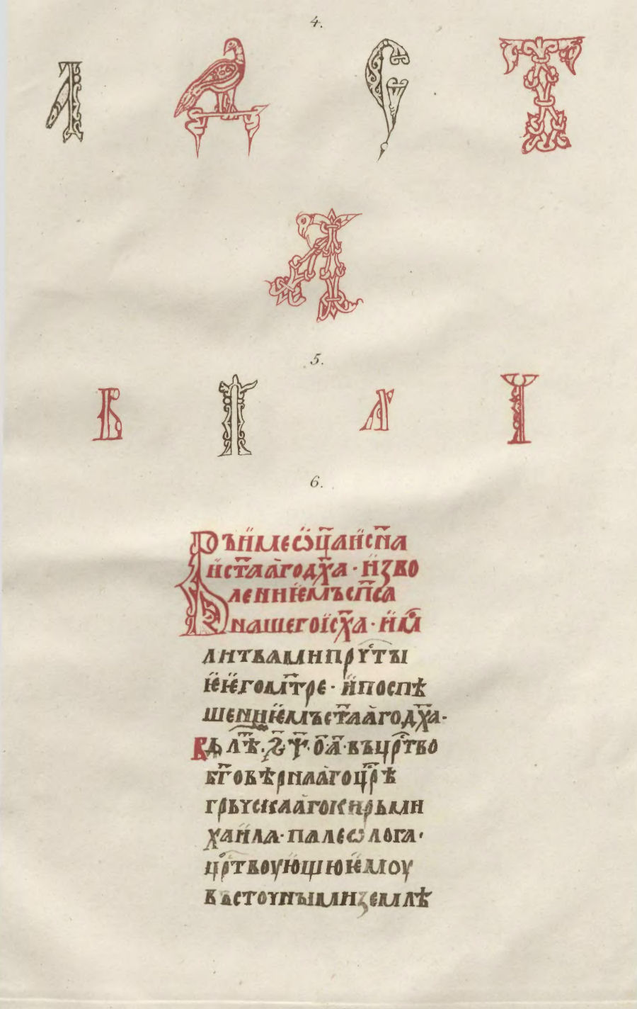 2. Большія буквы изъ сей рукописи: а, б, в, г, ѥ, з, и, м, н, о, п, р, с, т, x, ч и ı-а, взятыя съ листовъ: 102, 99, 172, 100, 9, 78, 119, 209, 128, 65, 102 на обор., 45, 194, 107, 165, 94 и 12.