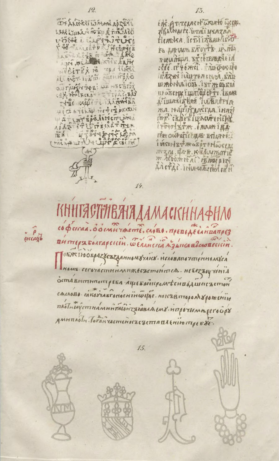 15. Четыре фабрикантскихъ знака въ бумагѣ сей рукописи: а) кувшинъ, 6) щитъ съ короною, в) неизвѣстный знакъ и г) рука съ короною