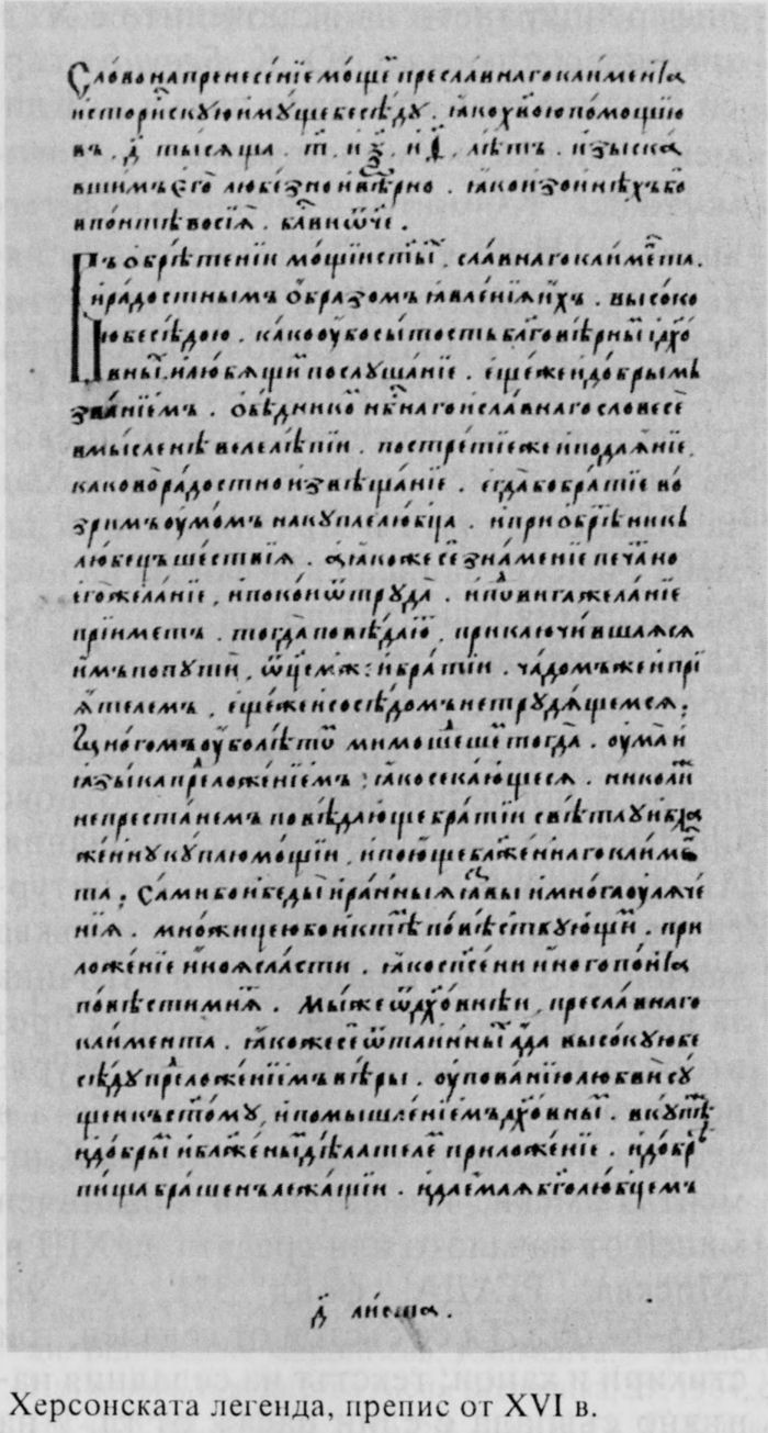 Тя е съхранена в ръкопис № 482 от XVI в. на Хилендарския манастир. Ценна летописна информация за Кирил и Методий съдържа руската Повестъ временных лет от XII в. — едно от най-значителните съчинения на руската средновековна историография. Кирило-методиевски мотиви в нея се съдържат в статиите за 6406 (898) и 6494 (986). Подчертана е идеята за единен слав. народ, за който са преведени книги в Моравия, а писмото е наречено славянско. Като съставител на слав. азбука и преводач на Свещеното писание Константин-Кирил е представен и в един лат. историографски паметник, който почива върху древни слав. източници — Дуклянската хроника (Regnum Sclavorum presbyteři Diocleatis) от XII в.