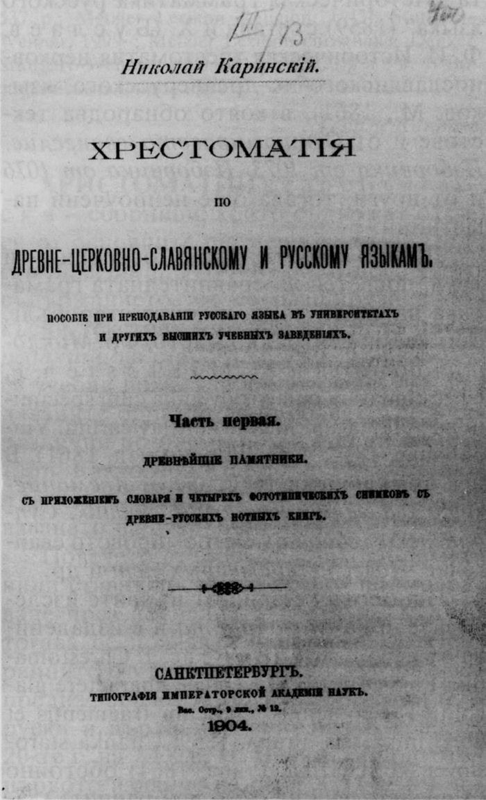 · Каринский Н. М. Хрестоматия по древне-церковно-славянскому и русскому языкам. 1. Древнейшие памятники. СПб., 1904. Рец.: Карский Е. Ф. — РФВ, 65, 1911, с. 270—271;