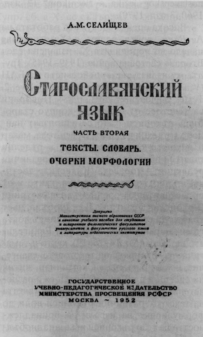 · Селищев A. M. Старославянский язык. 2. Тексты, словарь, очерки морфологии. Μ., 1952, 206 с. Рец.: Букатевич Н. И. — Русский язык в школе, 14, 1953, 3, с. 77—80; Леков Ив. — БЕ, 2, 1952, с. 124—127;