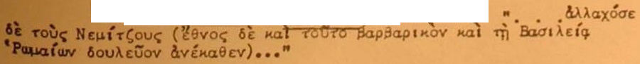 There may have existed more such transfers during the era of Byzantinization among the Slavs, but none remain. There is, nonetheless, one word which was part of the popular language of the Middle Byzantine Era which is without doubt Slavic in origin. This is the Slavic word for the Germanic peoples "Nemtsi" [115] which became, in Medieval Greek, "Νεμίτζοι." Constantine Porphyrogenitus gives clear indication that this word was the popular term for "German" used in lieu of "Bavarian," "Saxon," or other more specific official designations. [116] Although the word later disappeared from Byzantine Greek, it had quite widespread usage in medieval Byzantium. [117] So extensive indeed that it spread to the Arab world as well. The Slavic "Nemtsi" became the Byzantine "Νεμίτζοι" and from that the