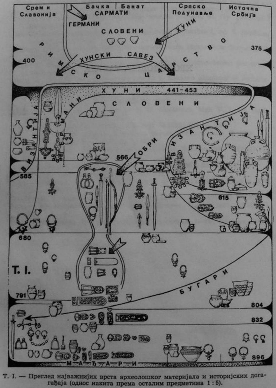Т. I. — Преглед најважнијих врста археолошког материјала и историјских догагађаја (однос накита према осталим предметима 1 : 5).