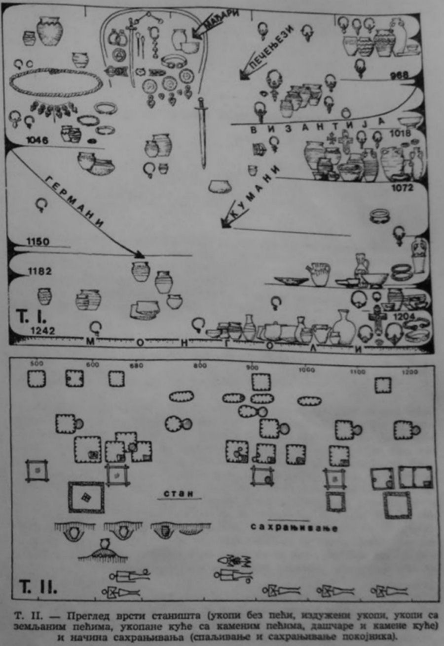 T. II. — Преглед врсти станишта (укопи без пећи, издуженх укопи, укопи са земљаним пећима, укопане куће са каменим пећима, дашчаре и камене куће) и начина сахрањивања (спаљивање и сахрањивање покојника).