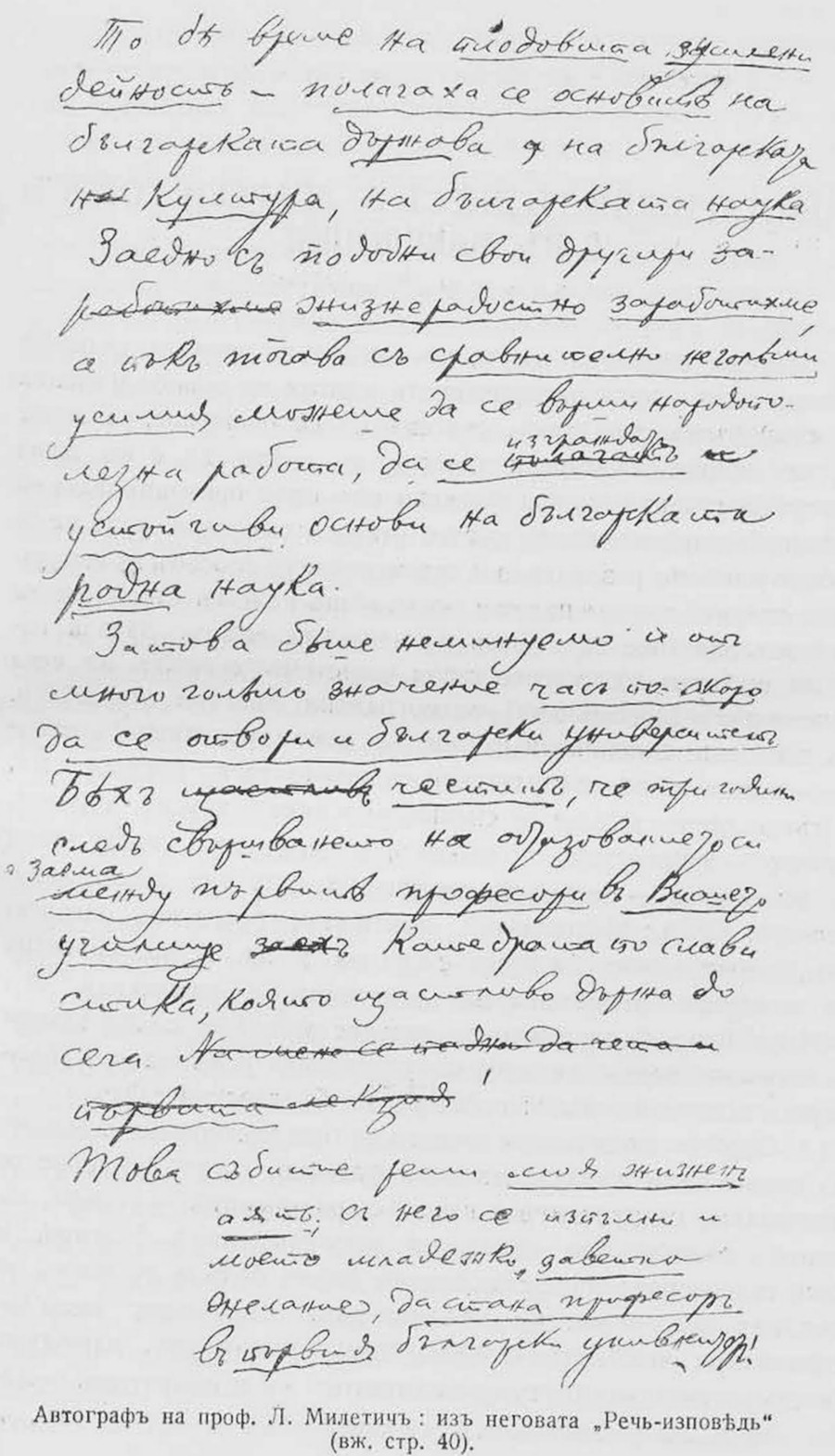 Автографъ на проф. Л. Милетичъ : изъ неговата „Речь-изповѣдь" (вж. стр. 40).