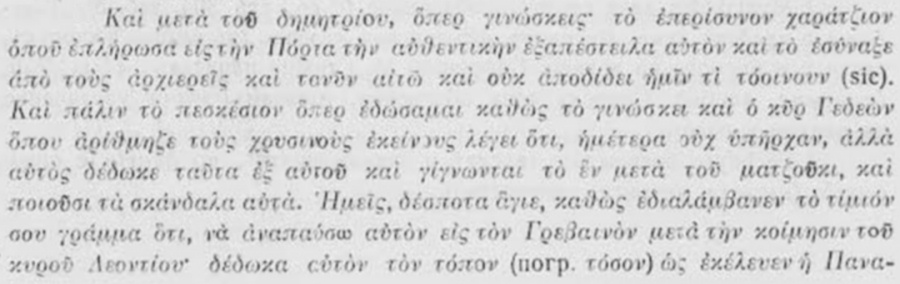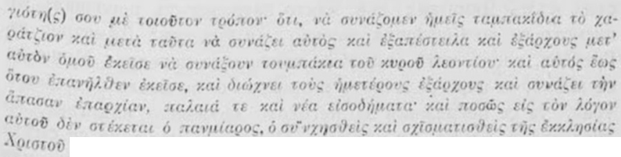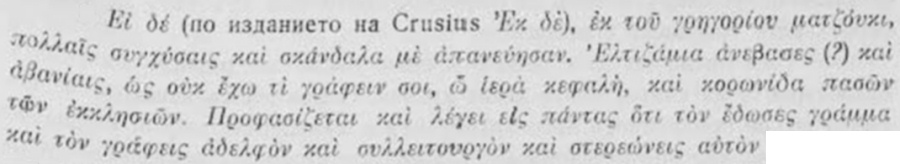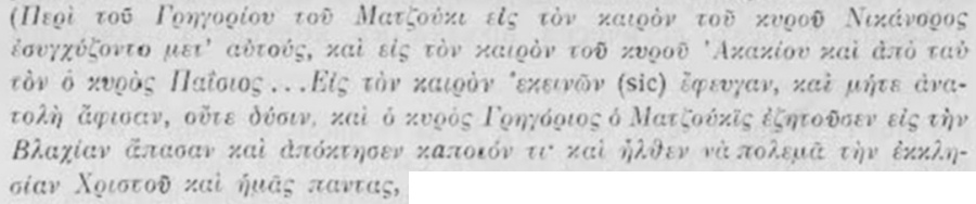 започналъ да се оплаква отъ Григория Мацуки, че много безпокойствия и скандали му правѣлъ, архиеп. Софроний не продължава да говори конкретно за неговата безчинна дейность, a посочва беззаконие на патриарха, когото предъ даа реда възхвали за помирителното му посрѣдничество, и следъ това пакъ продължава разказа си за Григория Мацуки [1]. Колкото и да не държалъ смѣтка за правиленъ синтаксисъ, архиеп. Софроний не губѣлъ логическата връзка на мислитѣ си. По-доле въ писмото си, като съобщава, че Григорий Мацуки заедно съ сподвижницитѣ си Максимъ и Гавриилъ и нѣкои костурчани „направилъ 600 жълтици елтизамъ", тои пояснява: „както писахъ преди" (= по-горе). [2] Явно е, че въ началото на писмото си архиеп. Софроний има предъ видъ елтизама [3] на Григория Мацуки и глагола ἀνέβασες е lapsus calami вм. ἀνέβασε. Така разказътъ за Григория Мацуки не се прекѫсва: „А отъ страна на Григория Мацуки ме сполетѣха много безпокойствия и скандали. Покачи (той) елтизами и (разпространява) клевети [4] до такава степень, не зная какво да ти пиша, о свещена главо и корона на всички църкви. Той представя за предлогъ и казва на всички, че ти си му далъ писмо и го наричашъ братъ и съслужитель и го подкрепяшъ.”