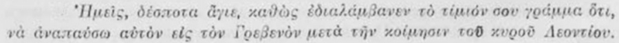 (y мене, п. съч., стр. 513). Понеже Софроний употрѣбява вин. п. вм. дат. (ὄτι τὸν ἐδοσες γράμμα), то глаголътъ νὰ γράφεις въ последното изречение може да сe отнесе къмъ предходнитѣ допълнения (вин. п.) и въ такъвъ случай изречението може да се преведе: „да пишешъ съ такова съдържание (букв. отъ такъвъ родъ) на низвергнатия и изгоненъ и причиняващъ страдания на църквата". Въ писмото има и други изрази, които мѫчно се превеждатъ буквално.