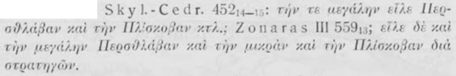 (Leo Diac. ed. Bonn., p. 13824). За втори пѫть името на Плиска подъ формата Πλίσκοβα се срѣща у Кедринъ и Зонара въ връзка съ поробването на Северна България презъ 1001 г. отъ Василий II, вж.