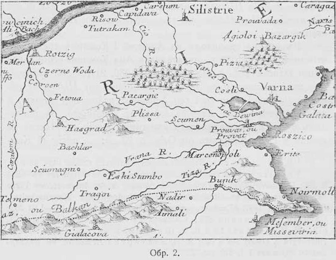 - Bulgaria et Romania etc. per Ger. et Leon. Valse, къмъ 1720— 1730 г. (Plisca обр. 6); Tabula, Hungariae et regionum etc. Correcta per Observationes Comitis Marsilii et nou nullorum aliorum, Per G. de L'Isle, Geographum Academiae Reg. Scientiarum