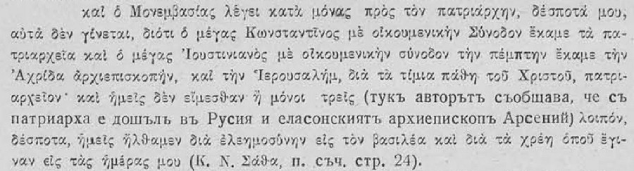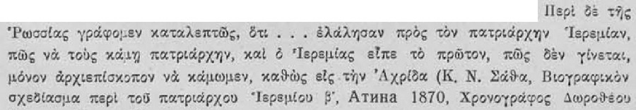 Противъ такова решение на руския църковенъ въпросъ застаналъ единъ отъ спѫтницитѣ на патриархъ Иеремия, монемвасийскиятъ