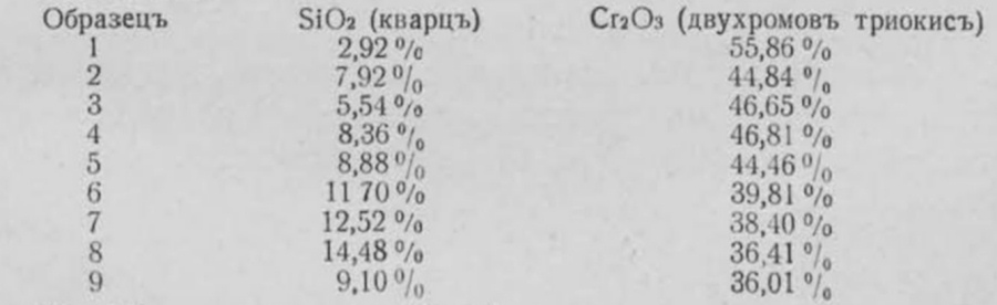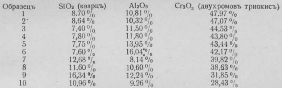 1. Десеть образци отъ хромитната руда отъ минитѣ при Вавдосъ (на 40-тина километра югоизточно отъ Солунъ) сѫ дали при химическия анализъ следния резултатъ;