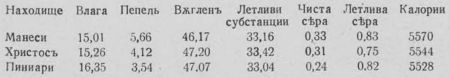 Нѣма да се спирамъ на лигнитнитѣ и кафявитѣ каменни вѫглища, които се намиратъ въ тая часть на Македония, която бѣше свободна и преди 6 априлъ 1941 година, защото сѫ много добре известни отъ труда на Коняровъ [2] и отъ отчетитѣ на д-во Гранитоидъ, което експлоатира най-голѣмото находище, при с. Брѣжане, на югоизтокъ отъ Симитли. Вѫглищата отъ това и нѣкои други находища въ североизточната часть на Македония сѫ най-добритѣ, които се намиратъ изобщо въ Македония.