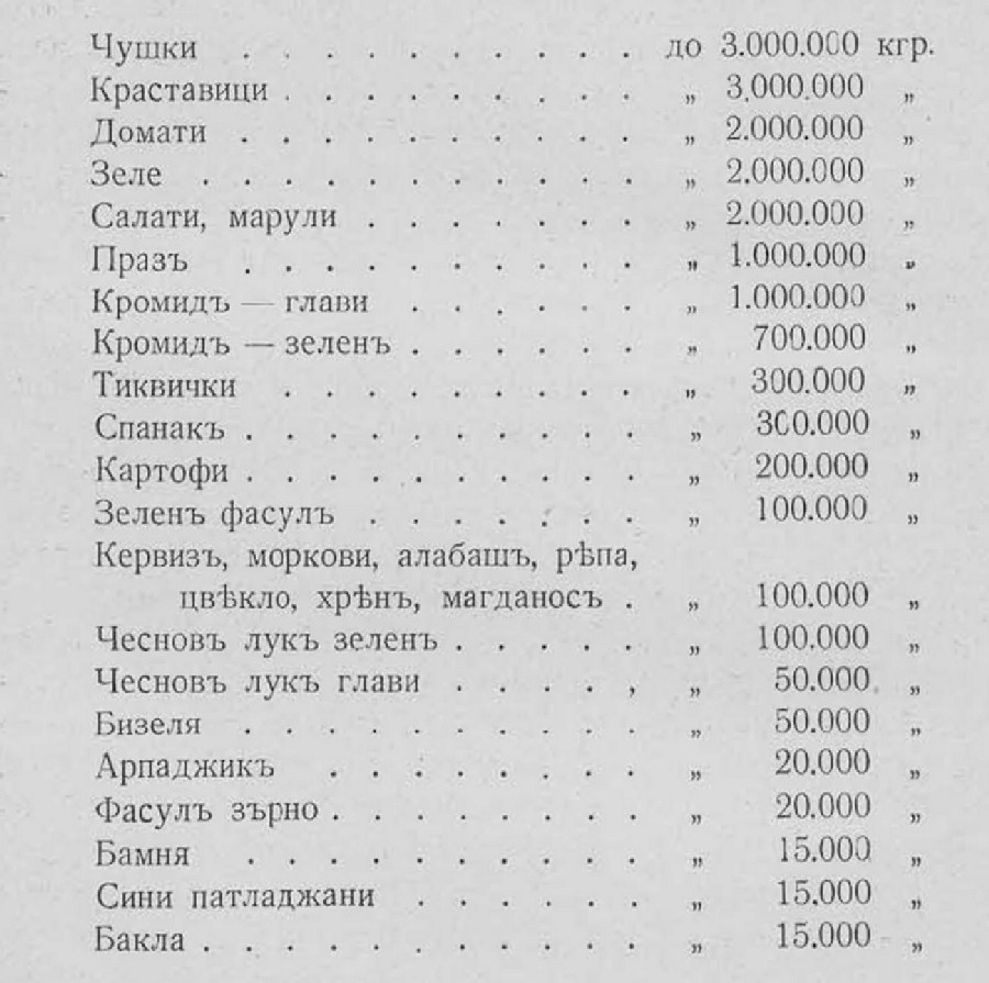 Въ последно време битолскитѣ градинари произвеждатъ годишно следнитѣ видове и количества зеленчуци: