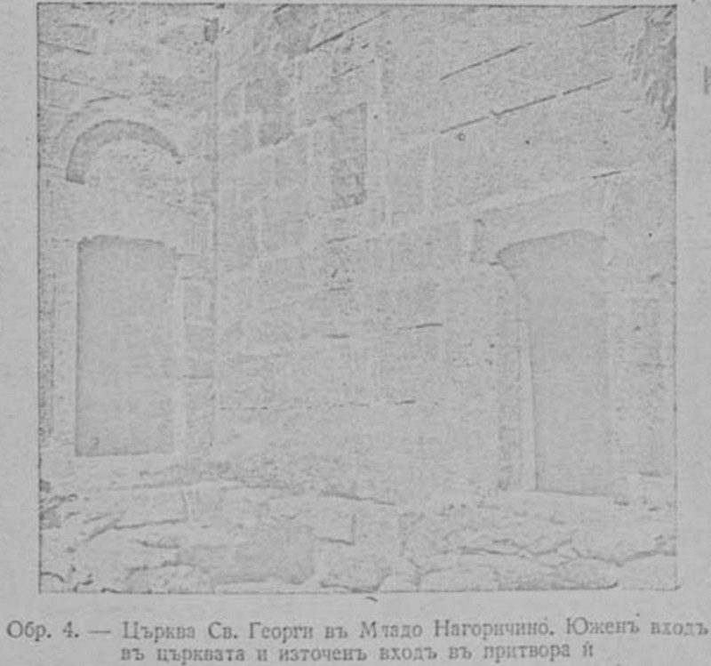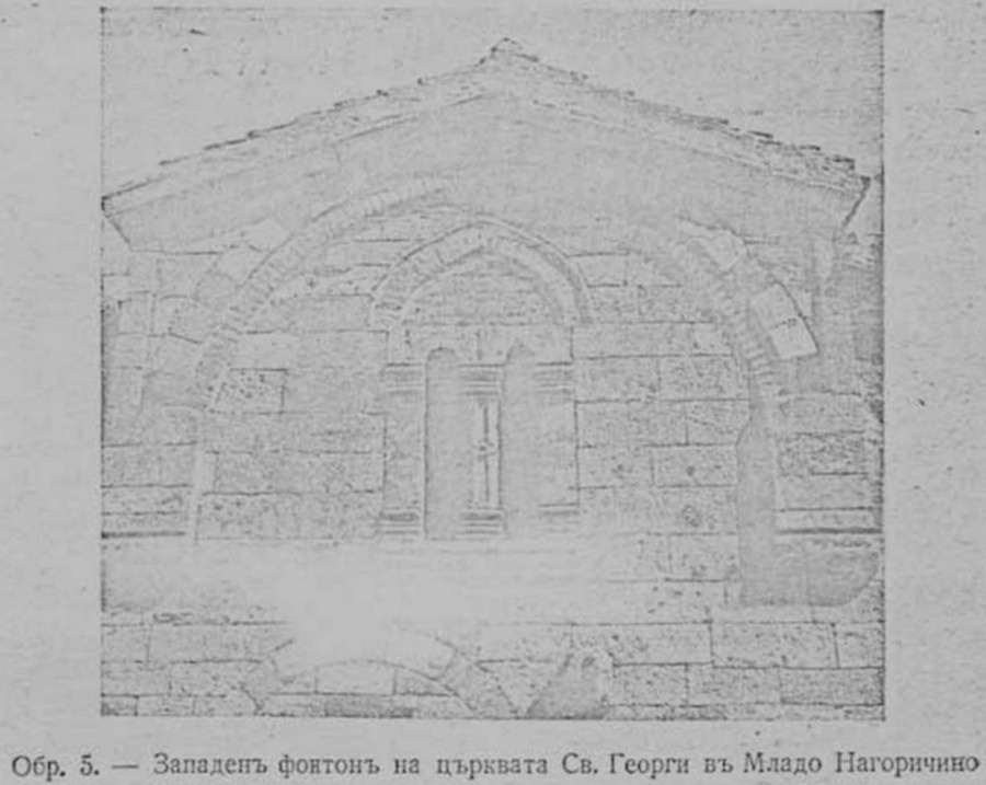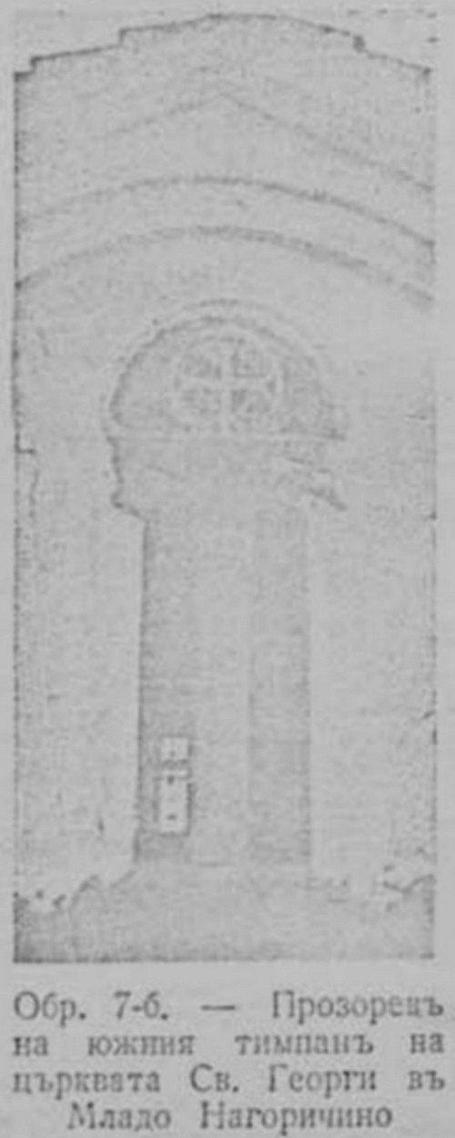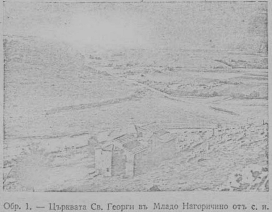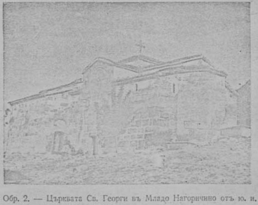 Отъ Куманово се опѫтихъ най-напредъ къмъ чисто българското село Младо-Нагоричино, раздѣлено на махали, които заематъ общо едно пространство съ дължина около 2 клм. Три чукара го раздѣлятъ на ширина и край тѣхъ сѫ били разположени старитѣ гробища. Споредъ мѣстната легенда, тукъ е имало около 15 църкви. Запазена напълно е само църквата Св. Георги. Две други — Св. Петка и Св. Никола — сѫ полуразрушени. Църквата Св. Георги, която се намира до самото шосе отъ Куманово за Кюстендилъ (обр. 1), е много известна между историцитѣ на изкуството на нашия полуостровъ. Тя е издавана много пѫти и датувана отъ различни епохи [1] — отъ XI в., отъ XIV в., а напоследъкъ [2] и отъ началото на XV вѣкъ. He ce очудвамъ никакъ, че В. Петковичъ [3] я поставя въ XIV вѣкъ, защото тендекцията му да включи тоя паметникъ въ сръбската архитектура е явна. За тая датировка той нѣма никакви научни доводи. Той се води по Кондакова, чиято фантазия създаде отъ младонагоричинскитѣ църкви гробници на сръбскитѣ крале [4]. Много по-сериозна е работата на Николай Окуневъ [5]. Той е спрѣлъ вниманието си на особената направа на прозорцитѣ на църквата и на издѣланитѣ по тѣхнитѣ колонки и тимпани декоративни релиефи. Той отбелязва съ право известни източни елементи въ тѣхъ, съвършено необичайни за тукашната тектура, но, както ще видимъ следъ малко, той взема погрѣшно нѣкои отъ тия източни черти за армено-грузински и погрѣшно заключава, че църквата е строена отъ арменци въ XI в. He по-малко сериозна е статията на Милое Васичъ [6] насочена