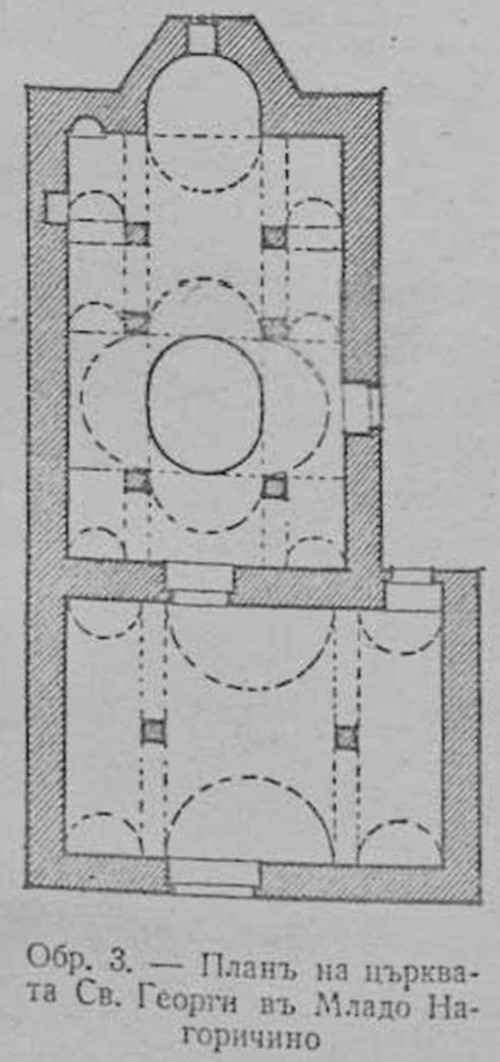 Църквата Св. Георги (обр. 2) въ Младо-Нагоричино е кръстовидна църква отъ „сложния” типъ, т. е. кръстовидна църква съ предапсидно пространство (обр. 3). Нейниятъ планъ обаче, както и покривната ѝ направа, сѫ съвършено особени. Куполътъ е замѣненъ съ елипсовидна калота и тая ѝ черта я отдѣля съвършено отъ всички познати намъ църкви отъ XI в.