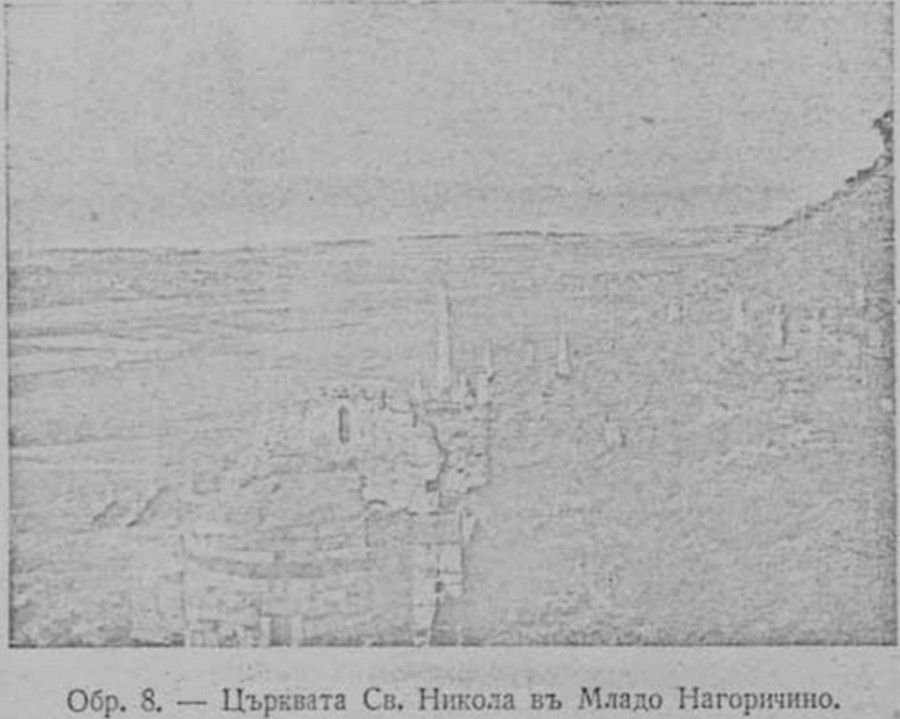 Заключенията, които направихъ, се засилватъ още повече отъ прегледа на дветѣ останали църкви. Св. Никола се намнра по-високо на хълла отъ Св. Георги. Отъ западната и страна се простиратъ гробища (обр. 8). Нейнитѣ сводове и горнитѣ части на стенитѣ ѝ сѫ изпадали. Тя е закрепена презъ сръбско време съ срѣдствата на Скопската бановина подъ рѫководството на кумановския инженеръ по системата, по която сѫ закрепени месемврийскитѣ църкви и която сърбитѣ заеха отъ насъ. Тя е еднокорабна, предшествувана отъ голѣмъ, колкото наосътъ, притворъ. По вѫтрешнитѣ странични стени на наоса е имало по две надлъжни арки и, вѣроятно и една напрѣчна. Такива арки е имало и въ притвора. Градежътъ ѝ е съвършено еднакъвъ съ тоя на Св. Георги. Че тя е строена едновременно съ тая последната, а може би и отъ сѫщитѣ майстори показватъ особеноститѣ на самия градежъ, а сѫщо и две подробности на тоя градежъ. Горнитѣ прагове на четвъртития юженъ прозорецъ и на южния входъ въ наоса сѫ профилувани по начина по които е профилуванъ горния прагъ на южната врата