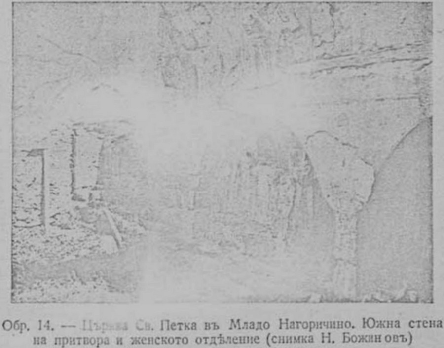 Обр. 14. — Църквата Св. Петка въ Младо Нагоричино. Южна стена на притвора и женското отдѣление (снимка Н. Божиновъ)