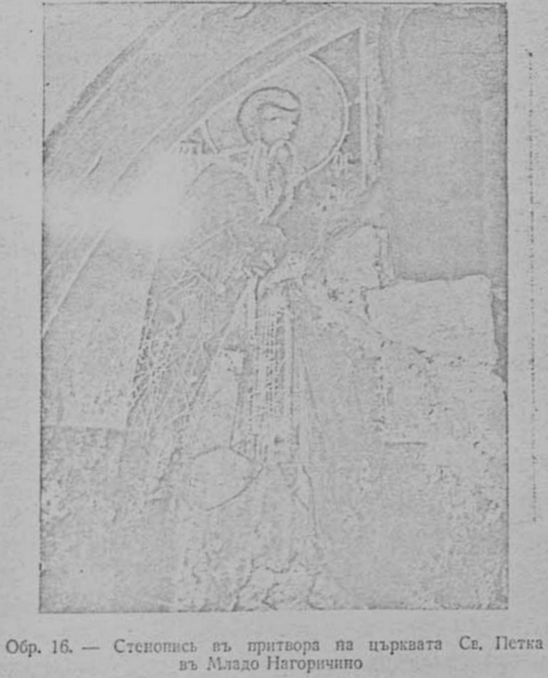 Тия крайно извишени образи напомнятъ издълженитѣ фигури въ стенописитѣ на Св. Петъръ и Павелъ въ Търново, които сѫ отъ края на XV вѣкъ. Сѫщата мощь се чувствува въ образа на Св. Теодоси, който е въ първата ниша на тая стена на църквата (обр. 16) Св. Петка въ Младо-Нагоричино. [1] Неговата глава показва ясно, че той принадлежи на македонската живописна традиция, но грамадното му високо тѣло е единъ късенъ белегъ. Колко е различенъ тоя светия отъ светиитѣ по църквитѣ въ Старо-Нагоричино и Матейче или отъ тия на късния XIV вѣкъ!