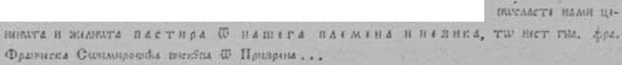 84. Acta Bulgariae, p. 141: Religiosi, che habitano in questi paesi, non solamente è necessario che sapiano la lingua valacca, ma etiam latina, greca, turchesca et particolarmente slava, perché viengono huomini di diverse lingue, et il vescovo di Soffia ha li suoi fratti che sanno latino, italiano, greco, valacho, slavo, albanese, turchescho etc.. Ma é più necessaria la slava, la quale sanno tutti, essendo nativi in quella, et li valacchi la tengono come latina etc. Католицитѣ отъ Ново-Бърдо изпратили презъ януарий 1653 г. писмо до Конгрегацията за разпространение на вѣрата (вж. Acta Bulgariae, pp. 225—226), въ което, между другото, благодарятъ на назначението на Франческо Соимировъ за призренски епископъ: