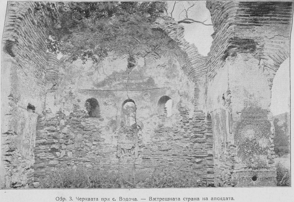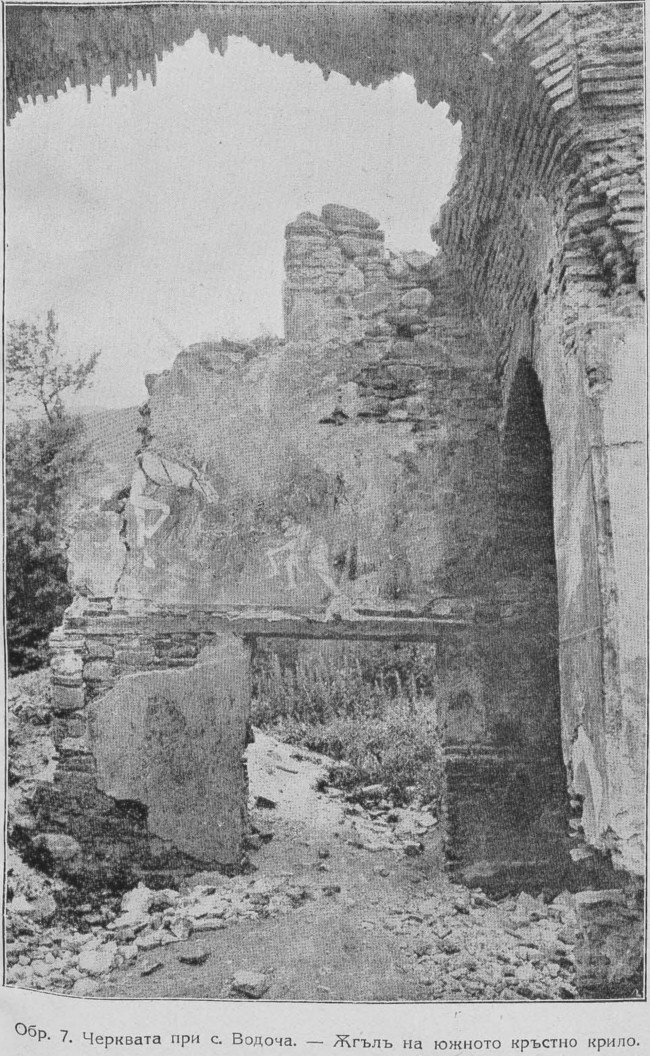 Следователно не е чудно, че въ старитѣ исторически източници нигде не се споменува за селото „Водоча", [1] отъ което, разбира се, не следва, че не може за манастира респективно за черквата при селото да сѫществуватъ стари спомени подъ нѣкое друго название. Тази мисъль ми идва, като имамъ предъ видъ сравнително колосалнитѣ размѣри на Водочката черква, която още при първъ погледъ ми направи силно впечатленне. Предъ мене се изпрѣчваха развалини на една голѣма, куполна, кърстовидна черква, обрасла по стенитѣ съ растителность, която тъй сѫщо сведочи, че тия стени сѫ старовременски. Това впечатление се усилва, като се влѣзе вѫтре, предъ вида на съсипнитѣ отъ съборенитѣ куполни сводове и на повечето оголени стени.