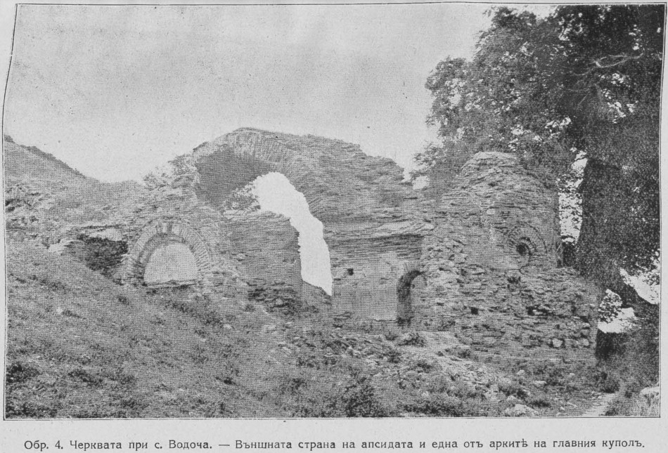 Обр. 4. Черквата при с. Водоча. — Външната страна на апсидата и една отъ аркитѣ на главния куполъ.