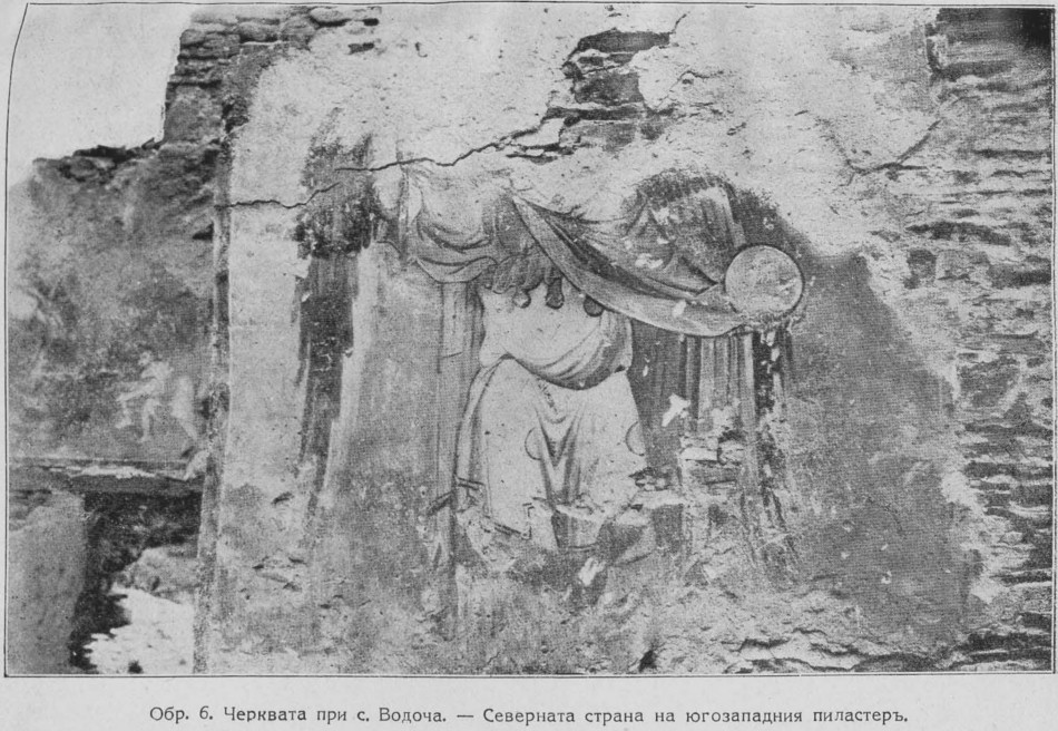 Не допускамъ, че въ 1896 година черквата да е била въ такова състояние, че да е можело съ малки поправки да се приспособи за селска черква, както казва архимандритъ Герасимъ. Вѣроятно е напротивъ, че по пода на черквата е имало тогава много разхвърлени колони и камененъ материалъ отъ съборенитѣ стени, за които въ Струмица ми казваха, че неотколе сѫ били употрѣбени за изграждане на новата черква, захваната следъ опожаряването на старата струмишка черква въ голѣмия пожаръ презъ 1913 г. Тази нова черква тогава още не бѣше довършена. При това състояние на Водочката черква бѣхъ изненаданъ и отъ малкото останки отъ стенната живопись, които веднага приковаха вниманието ми поради очевидно старовремския си характеръ, при това отличаващи се съ яркитѣ си бои и главно съ сравнително голѣмата си художественость поради живостьта на картинитѣ. Между последнитѣ най-силно впечатление ми направиха голѣмиятъ арахангелъ и сцената, гдето се посрѣща Исусъ Христосъ, възседналъ на ослица, запазена само на половина, както е видѣтъ на снимкитѣ № 6 и № 7 по-долу. Не се съмнявахъ, че и тѣзи фрески сѫ старовремски, особено следъ като се указа, че подъ тѣхъ, въ по-долнитѣ пластове на мазилката, която разчоплихъ на нѣколко мѣста, не се виждаха следи отъ по-стара стенна живопись. Като видѣхъ състоянието, въ което бѣха изоставени развалинитѣ на тая ценна старина, обречена на бързо съсипване до край, постарахъ се фотографически да снемемъ запазенитѣ фрески, доколкото бѣ възможно по-добре, което отлично изпълни вещиятъ въ такава работа Георги Трайчевъ, както читателътъ може и самъ да сѫди споредъ приложенитѣ тукъ 11 фотографични репродукции. Не мислѣхъ тогава, че нѣма вече втори пѫть да видя Водоча, та и не взехъ размѣритѣ на черквата, като смѣтахъ, че допълнително ще трѣбва да се снеме точенъ планъ на постройката отъ вещо лице. Презъ световната война вниманието ми бѣ отвлѣчено къмъ други области на Македония, а следъ това Струмица стана за нашитѣ учени недостѫпна. По-обстойно проучване на черквата безъ съмнение ще се извърши съ време отъ други [1]. Нашитѣ снимки отъ черквата при Водоча
