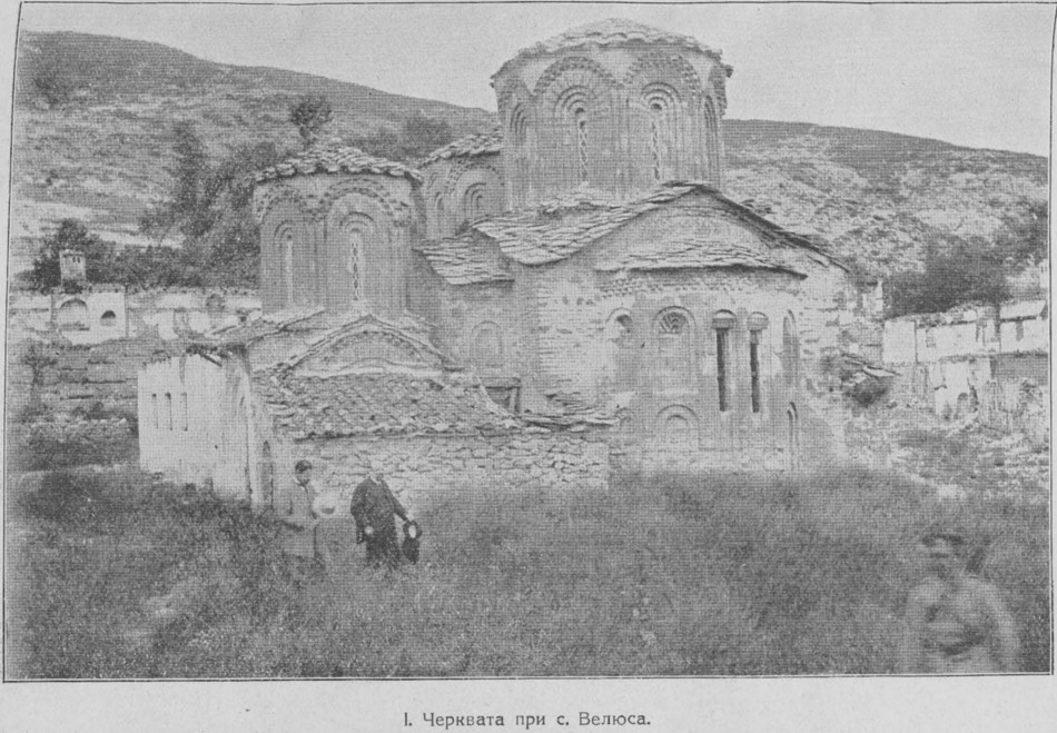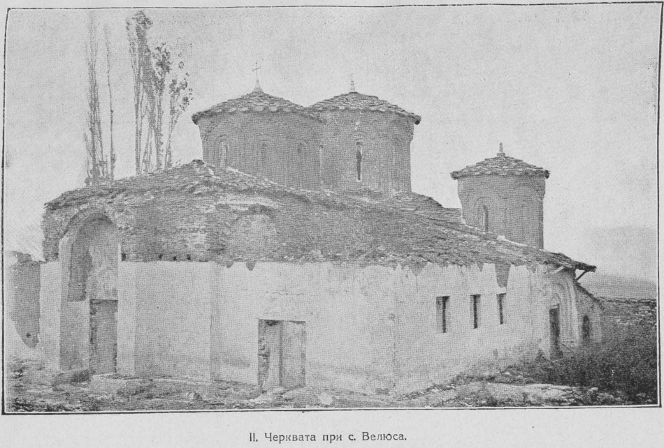Отъ Водоча се упѫтихъ къмъ с. Велюса (Велюша), което се намира 10 километра западно отъ града, за да видя тамкашната манастирска черква, за която знаехъ, че е датувана на единъ, запазенъ надъ черковната врата надписъ отъ XI столѣтие и че още е читава, ако и значително пострадала отъ пожара, понеже въ 1913 год. тъй сѫщо е била подпалена отъ гърцитѣ при отстѫплението имъ отъ Струмица. Очаквахъ че и Велюшката черква ще има поне размѣритѣ на Водочката, и затова останахъ донегде разочаруванъ, когато съзрѣхъ една сравнително малка черква съ три купола отъ типа на известнитѣ византийски черкви отъ XIII—XIV вѣкъ, каквито толкова често съмъ ги виждалъ и въ западна Македония. Отъ репродукциитѣ на дветѣ фотограф. снимки на Велюшката черква, които тукъ следватъ, едната я показва откъмъ източната, олтарна часть, а другата откъмъ югозападъ. Пожарътъ, зз който казахъ, както се вижда и на снимкитѣ, е засегналъ само страничната южна, по-нова пристройка на черквата, а напълно е унищожилъ само лекитѣ манастирски сгради околовръсть. Вѫтре въ черквата се виждаха попукани мѣста по сводоветѣ. За жалость не бѣ ни възможно да